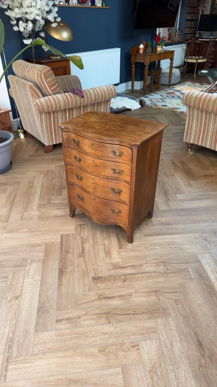 This Georgian Style Serpentine Mahogany Chest of Drawers is located in West Sussex, United Kingdom
