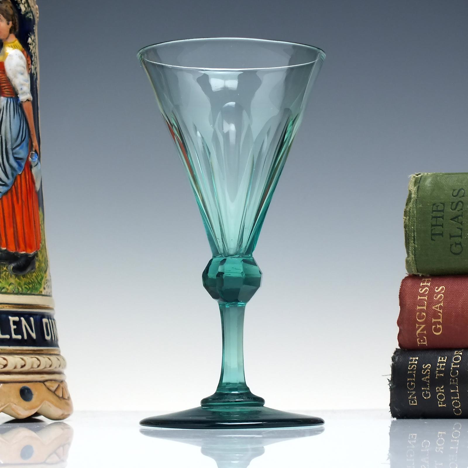 A fine George IV wine glass dating to 1825. In a wonderful teal green colour, it has a slice cut conical bowl, the cutting continuing down through the shoulder and knop and stem. Conical foot.