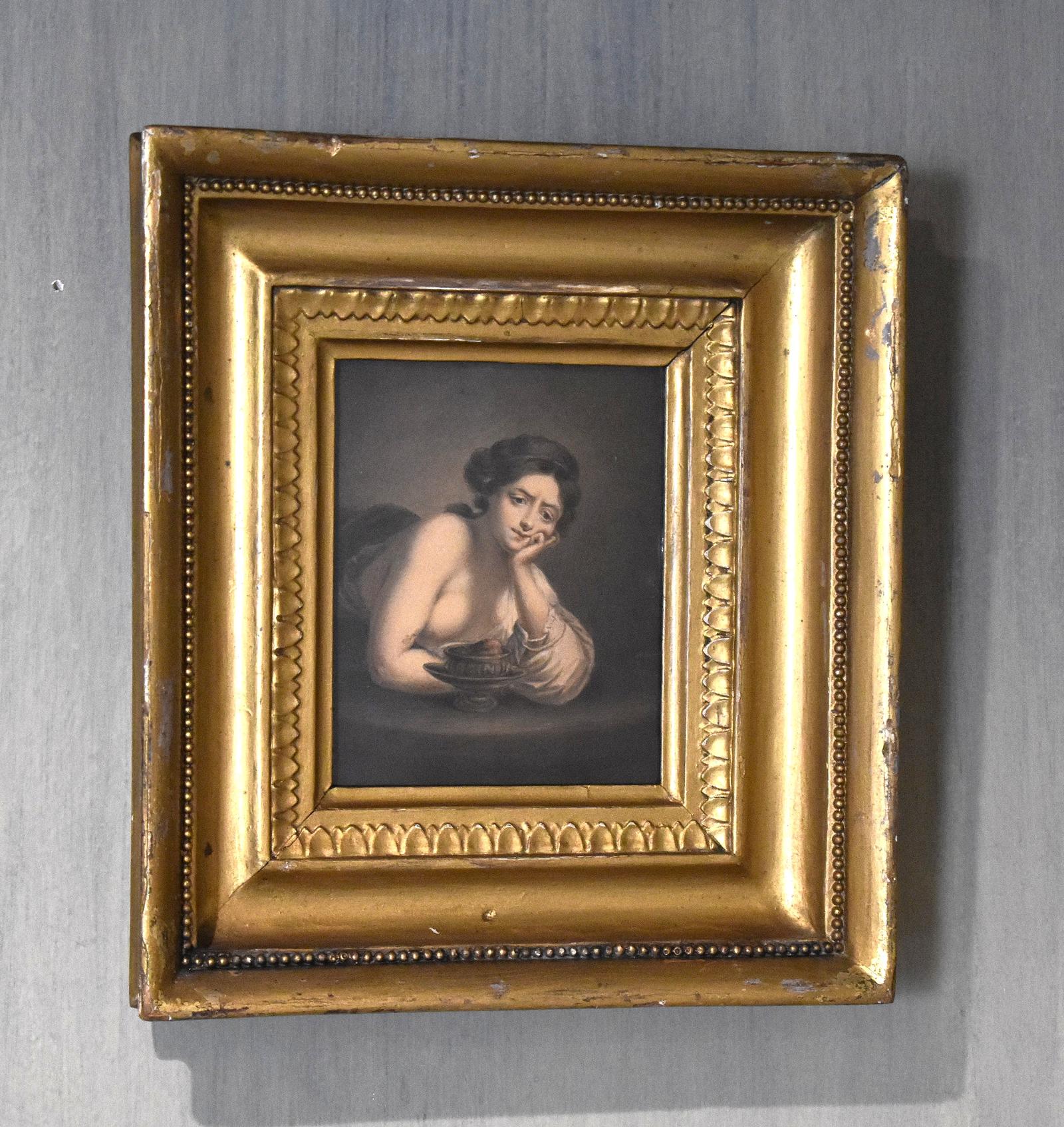 A fine watercolour depicting Sigismunda weeping over the heart of Guiscardo from The Decameron, by the artist Albin R Burt 1783-1842. The scene is worked in minute detail and of stunning quality. The painting is in good condition with just the usual minor fading with time. It is signed to the right ‘A R Burt’. Albin Roberts Burt was born in 1783 the son of Harry Burt and Mary (nee Roberts). His brother was secretary to Lord Nelson and his mother was an intimate of Emma Hamilton. He trained as an engraver under Robert Threw and Benjamin Smith but later turned to portraiture. He exhibited at the Royal Academy from 1807-1830 while living in London but he worked as an itinerant portrait painter travelling around the whole country. This work is interesting for the artist and was inspired by a painting of Hogarth’s completed in 1759. The gilt frame is the original with some overpaint. The whole is an interesting and decorative Georgian work. C.1820.