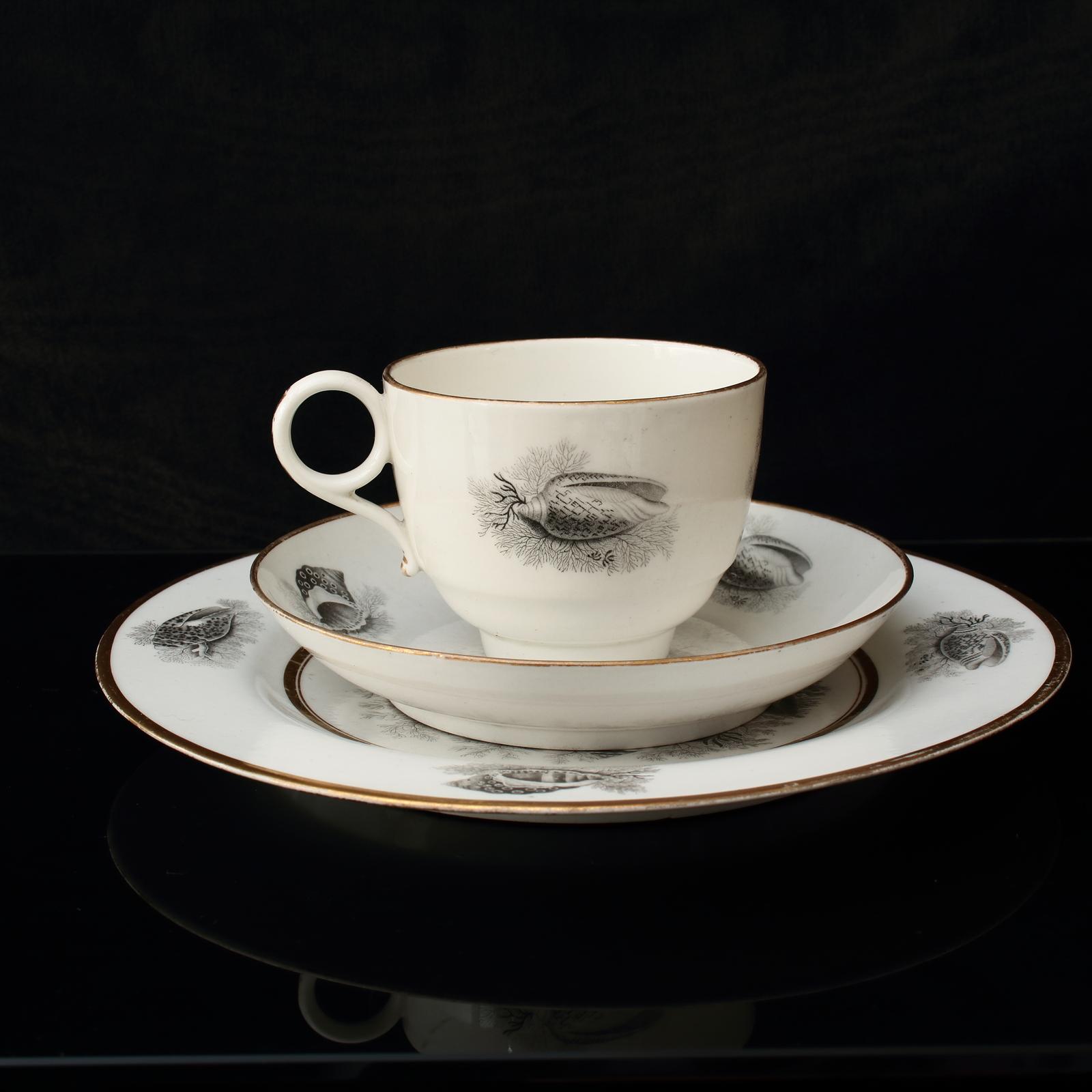 A wonderful trio of English Georgian Worcester Flight Barr and Barr coffee cup, saucer, and side plate, with gilt borders and beautiful black and white transfer decoration of sea shells. Made in the early part of the 19th Century, underneath the FBB impressed mark on all pieces.