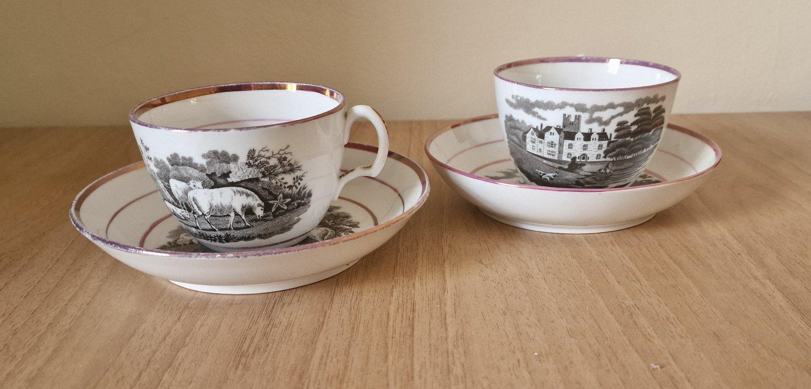 Georgian/Regency Rathbone Pink Lustre Bat Printed Pair of Tea Cup and Saucer