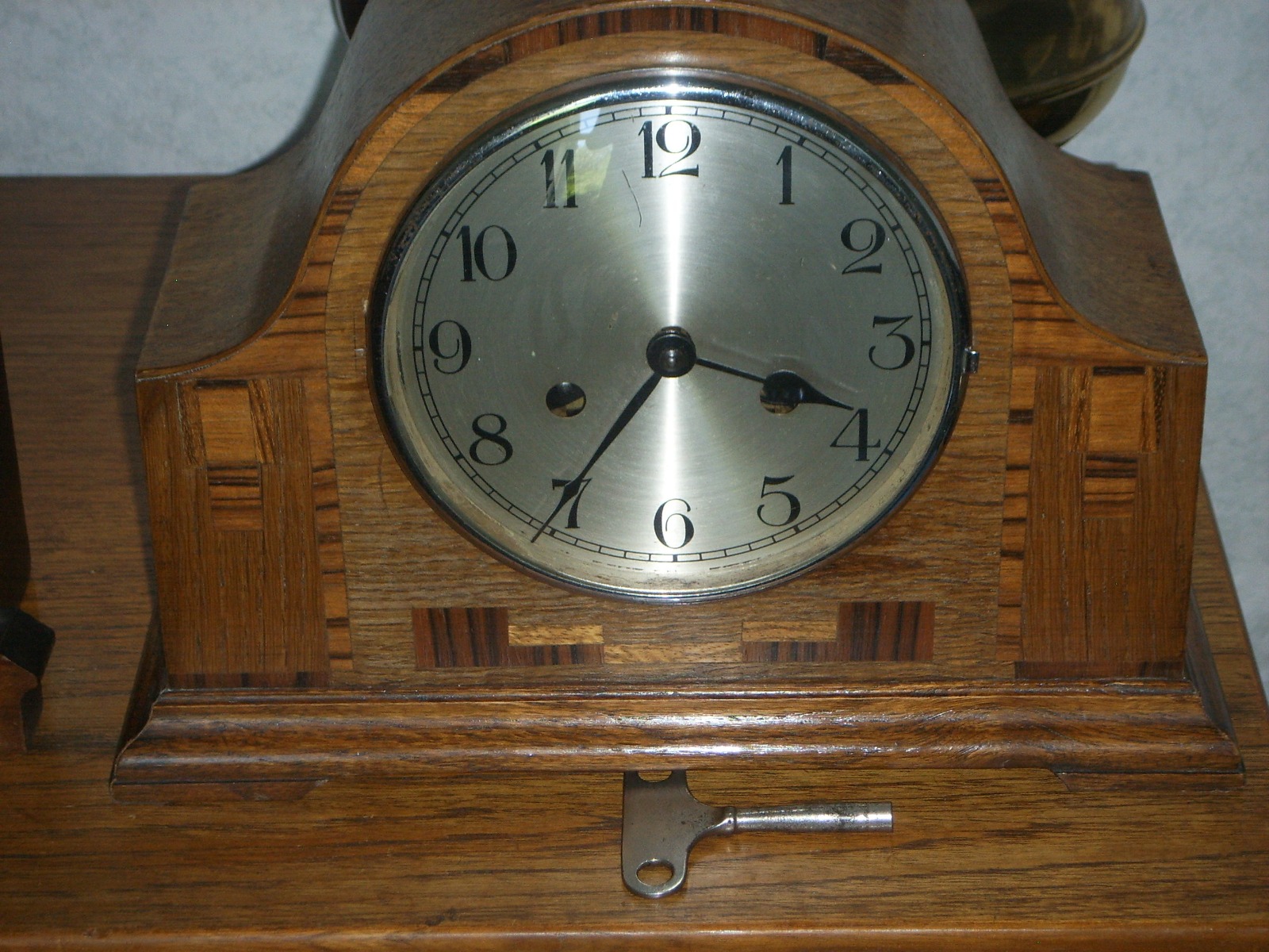 German Mantel Clock. Oak Casing. Black Numeral On Silver Face