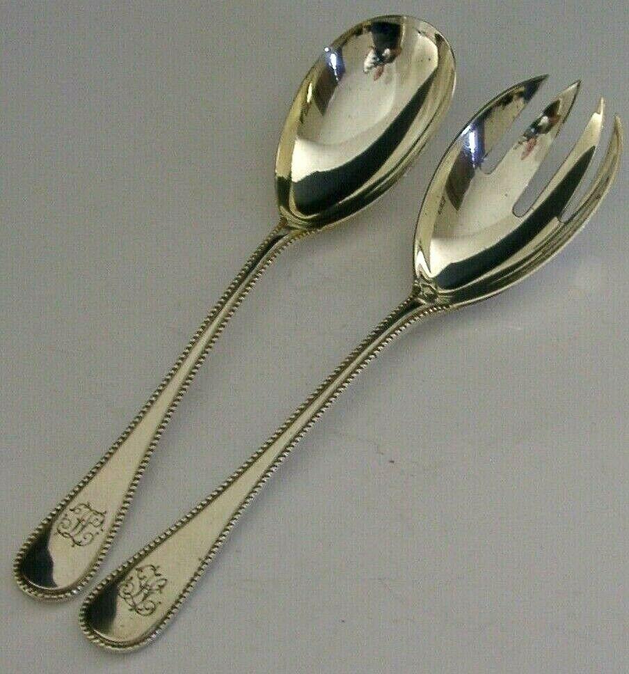 German Solid 800 Silver Beaded Pattern Salad Servers - Antique c.1900