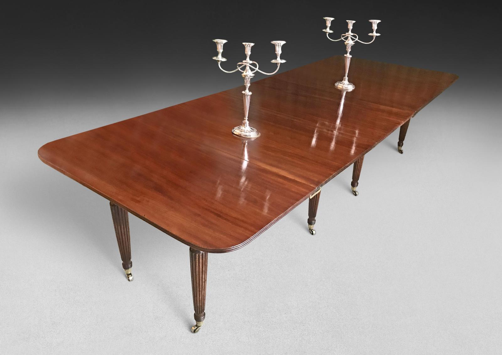 An extremely rare and important George III Period Mahogany Extending Dining Table, patented by Gillows in 1800. This unique design features a rotating centre leaf, allowing it to be used as a serving or side table when not in use for dining. The original design is in the Gillows work books and is the forerunner of the Imperial Dining Table which superseded this example by 1805. It has retained all 5 original leaves and is a spectacular run of solid mahogany when opened, measuring 122”, 310cm x 46”, 117cm. The telescopic bearers are supported on 8 ring turned, tapered and reeded legs terminating in Brass cups and castors.