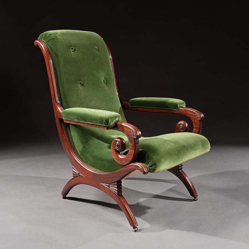 Gillows Regency Mahogany and Green Velvet Spanish Armchair