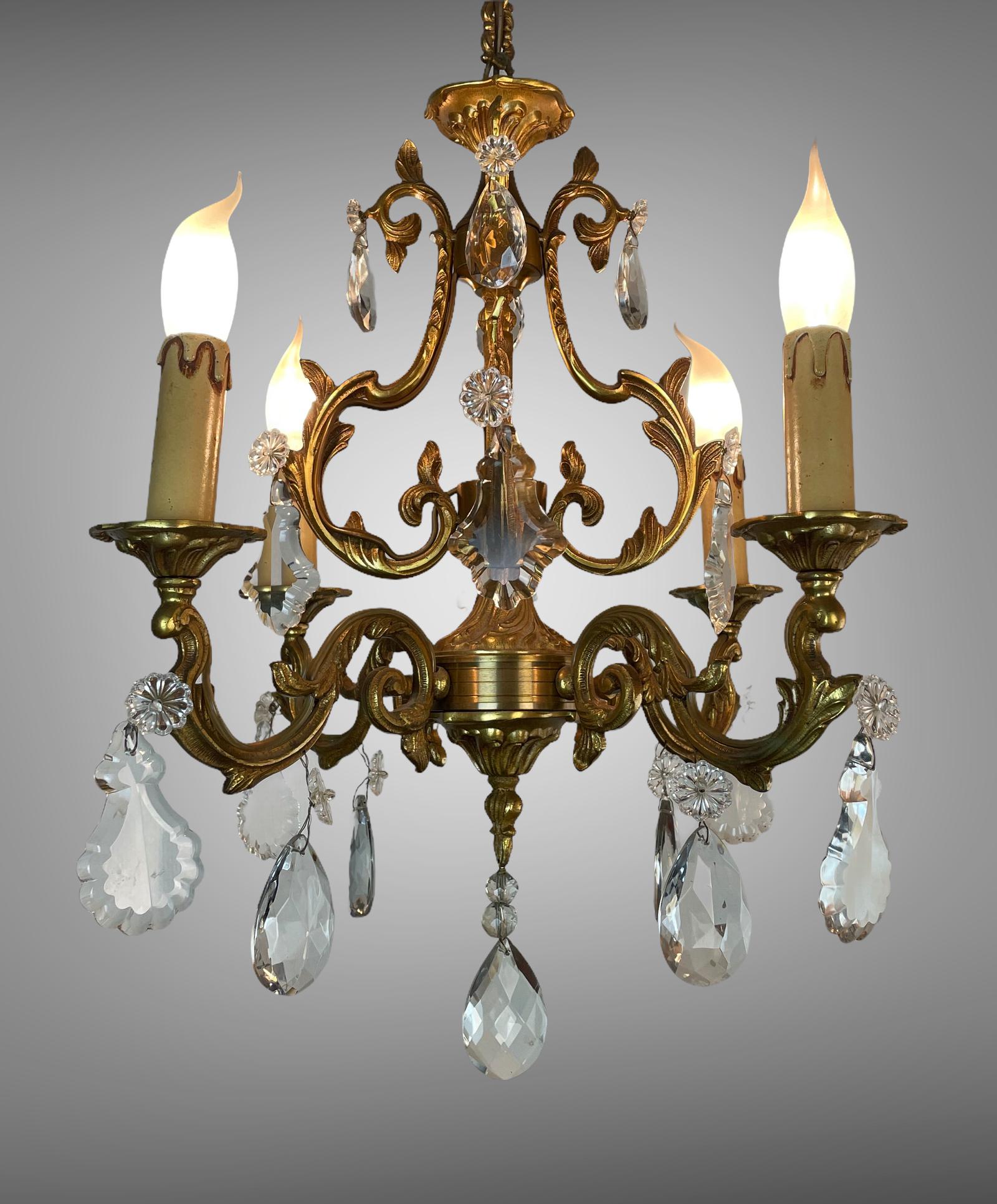Gilt Bronze 4 Arm Chandelier Ceiling Light with Glass Droplets