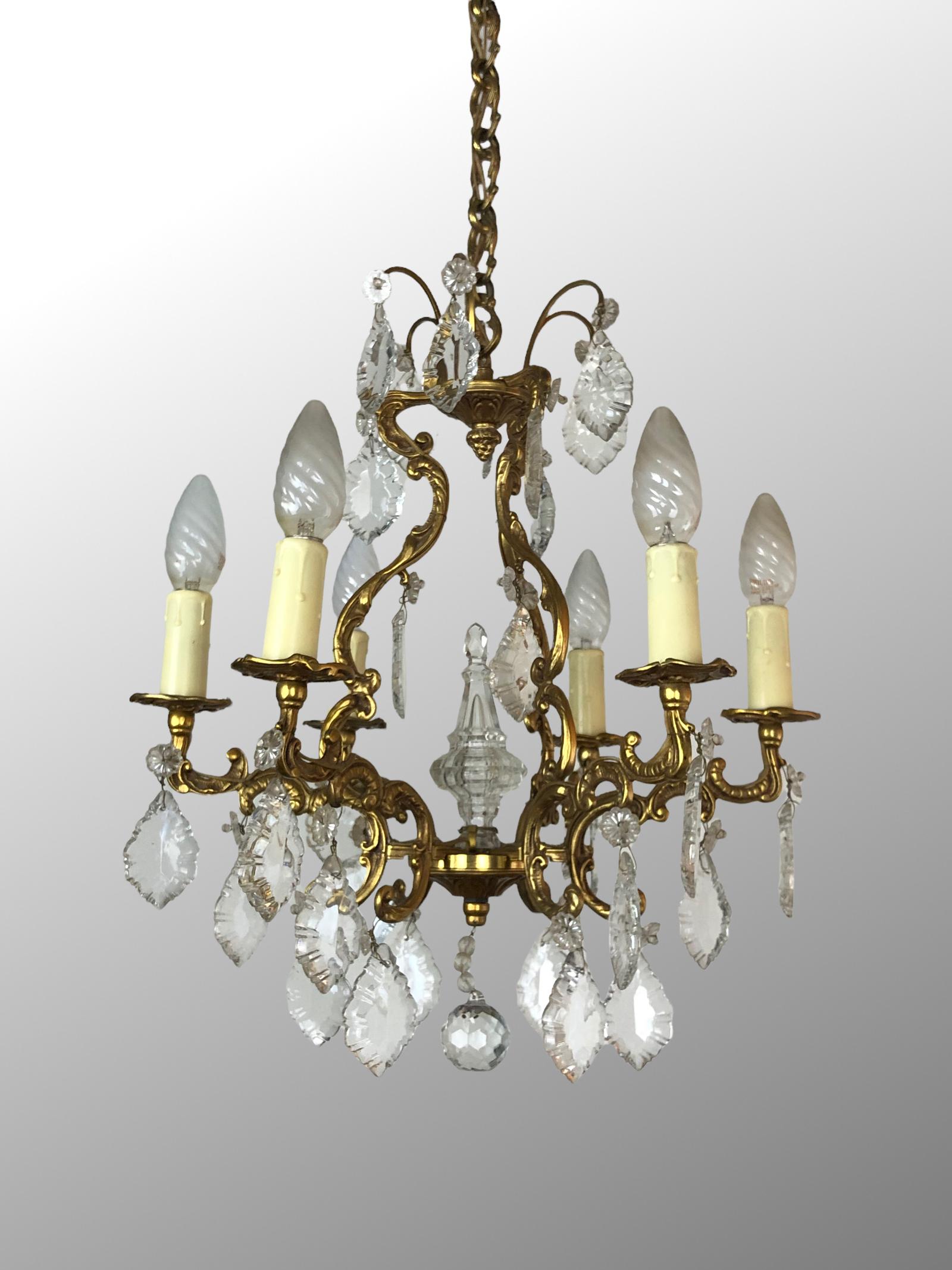 Gilt Bronze 6 Arm Stunning Chandelier Ceiling Light with Crystal Droplets