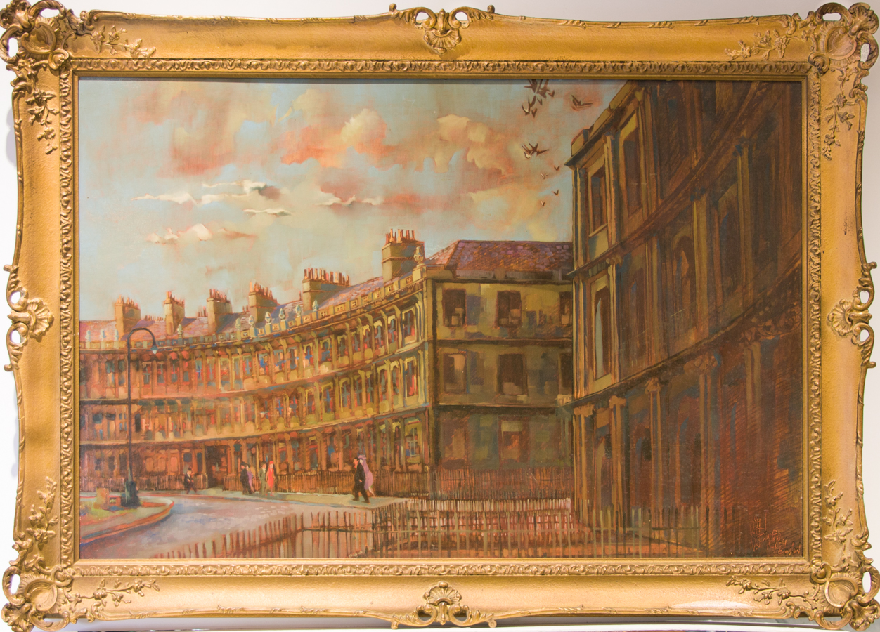Gilt Framed 1964 Modern British Oil - Street Scene at the Circus, Bath