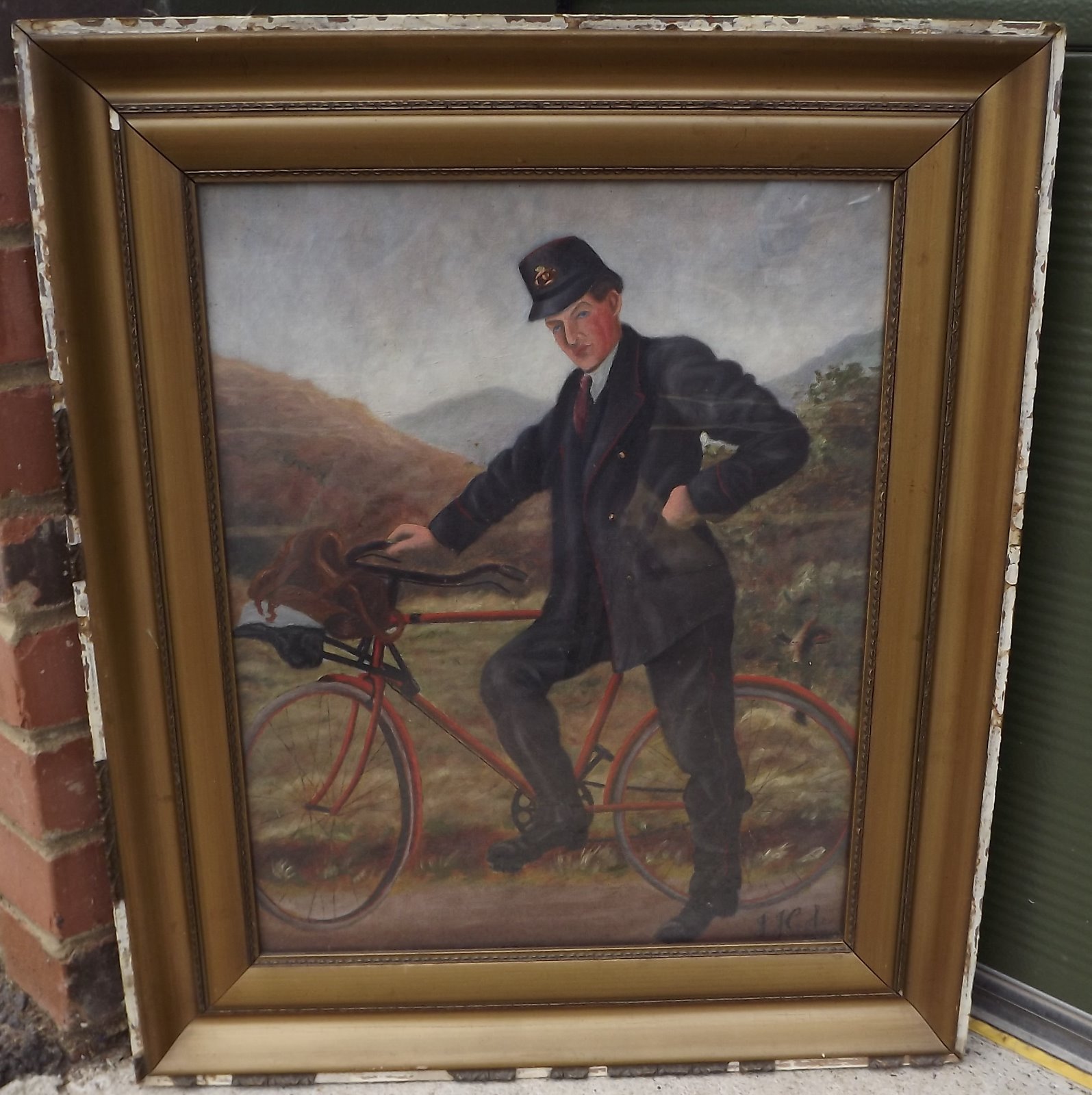 Gilt Framed Oil on Canvas Painting of a Postman by J.J. Cole