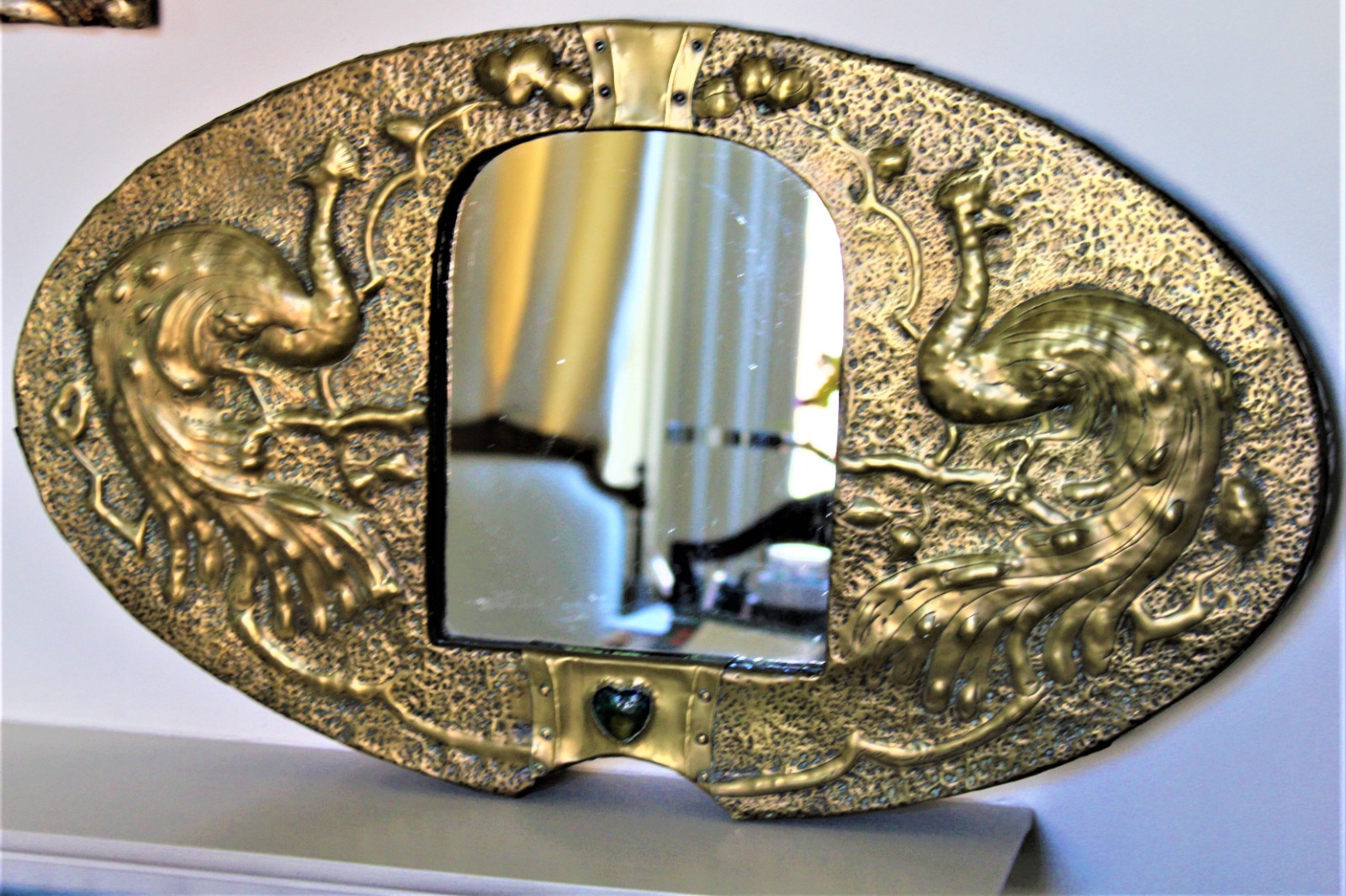 Glasgow School Brass Arts & Crafts Mirror of Oval Form with Peacocks Flanking the Central Mirror