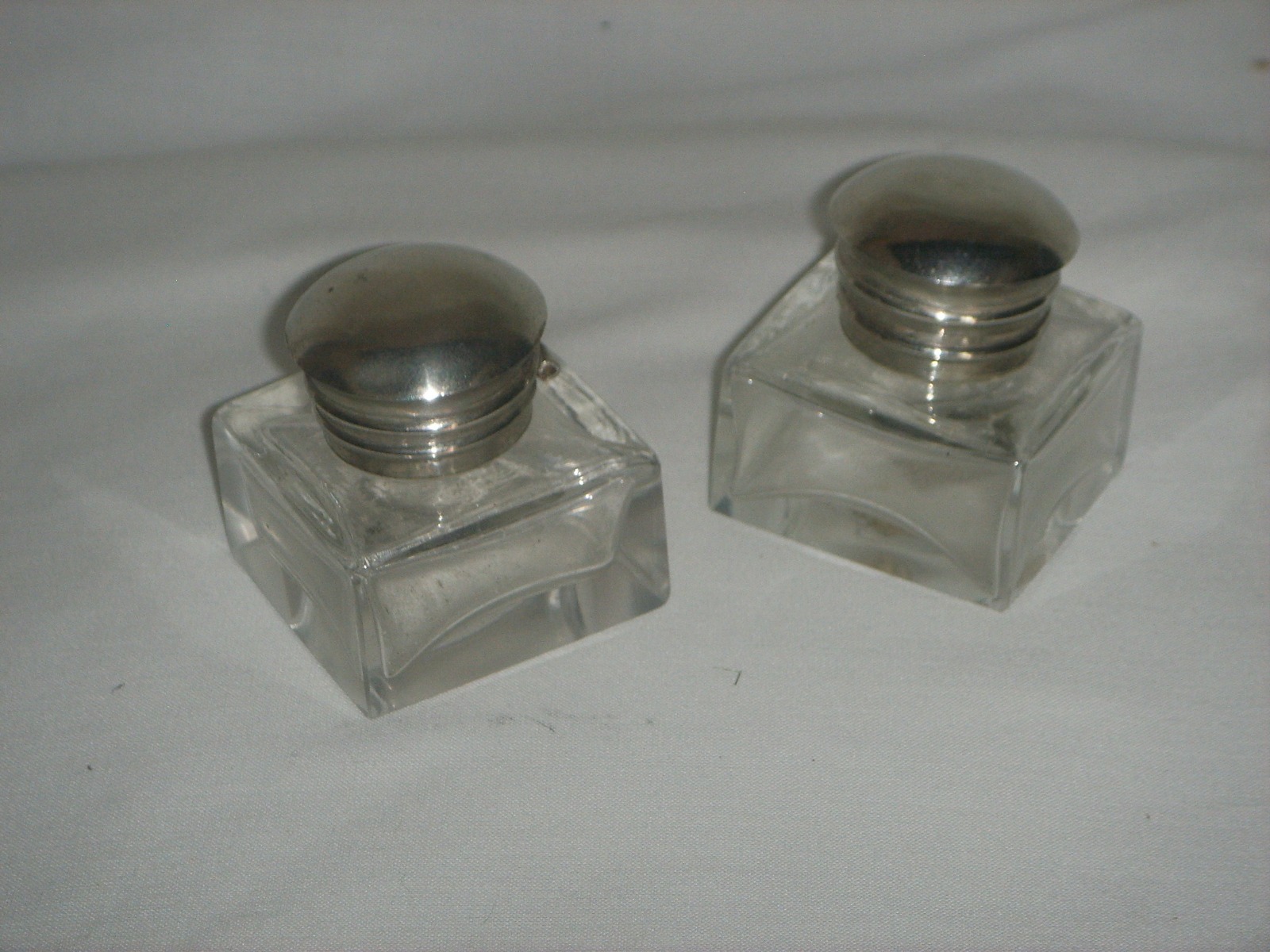 Glass Inkwells. Pair of Small Inkwells. Silver Metal Top on Glass