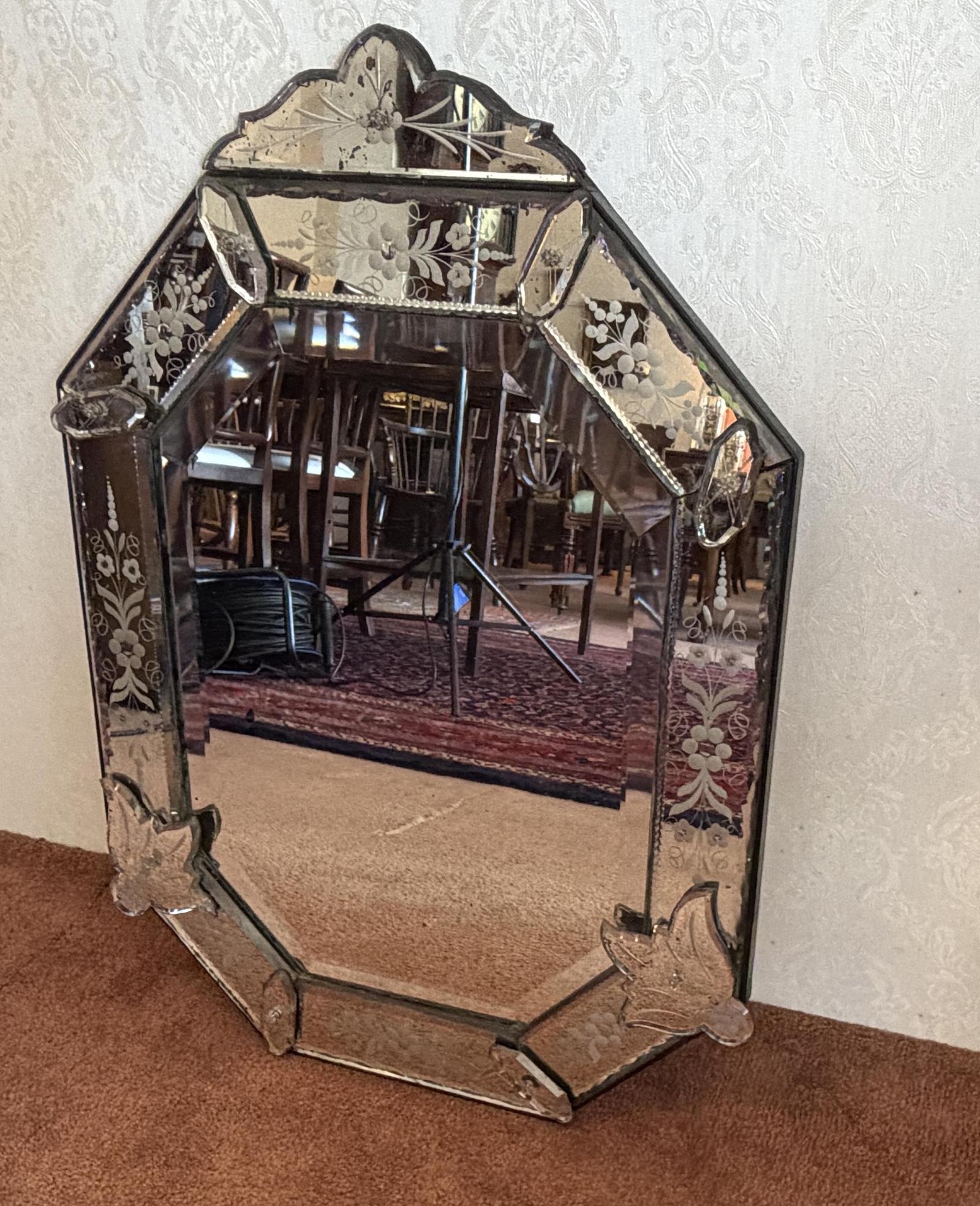 Offered for sale is this late 19th Century antique glass mirror of Venetian origin. Beautifully cut panels and bevelled glass. Very pretty.