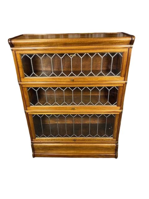 This very practical antique Globe Wernicke style mahogany bookcase is ideal for smaller spaces. It has three lift glass fronts with shelves for your books or collectors items all in a light honey colour.