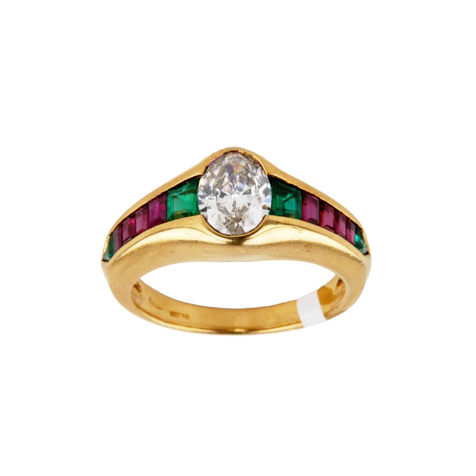 Gold ring, 18 carats with diamond, emeralds and rubies.