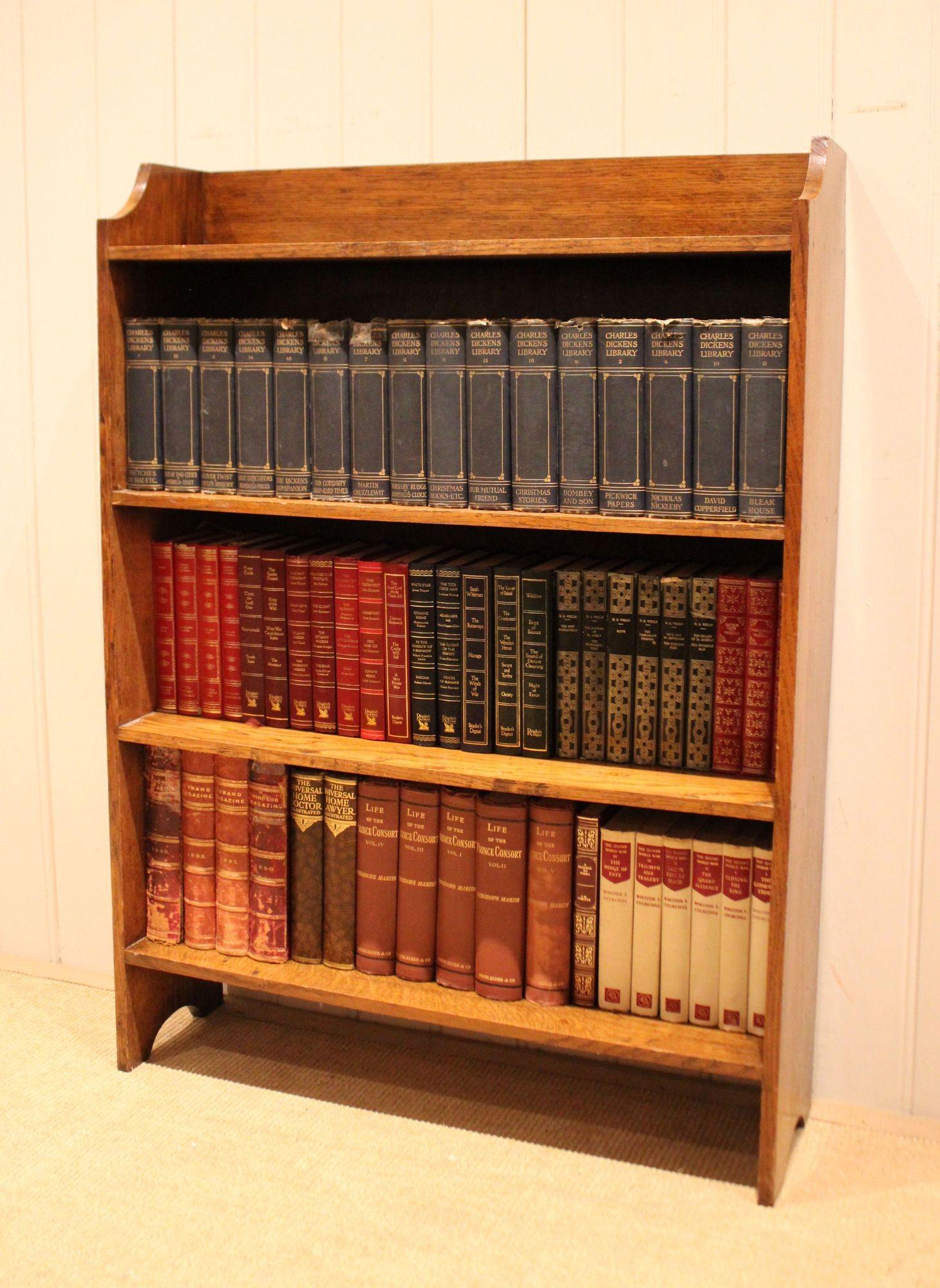 Offered for sale is this golden oak open bookcase having three fixed shelves with a shaped top, raised on side brackets.