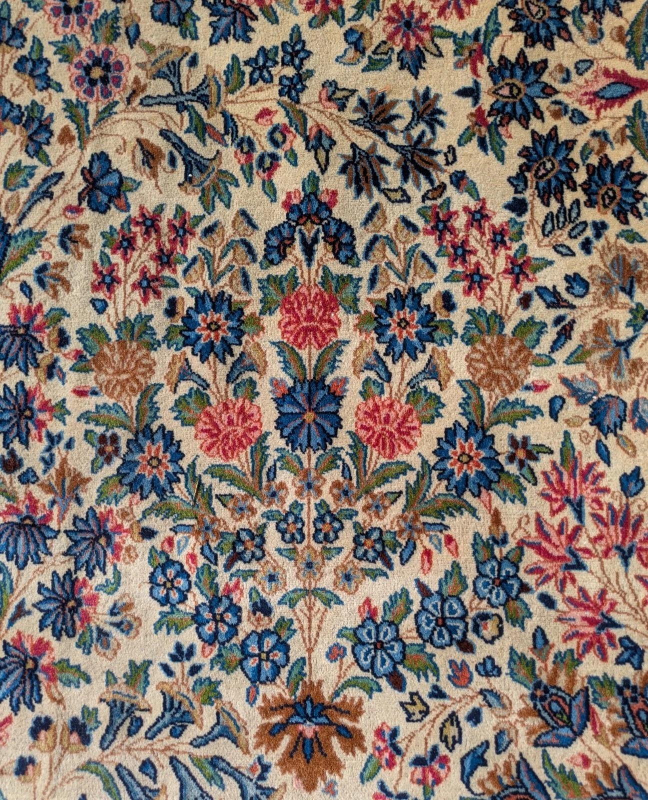 This is a wonderful handwoven antique Kirman carpet dating from around 1930. The soft woollen carpet is beautifully drawn and woven from the finest kork wool. It has a classic Kirman design, with arching boughs of colourful pastel blooms throughout the warm vanilla field all enclosed by multiple flower filled borders with boteh and scrolling vines. The design is most pleasing and the colour palette very easy to live with, featuring corals and blues, indigo and a very nice sage green.