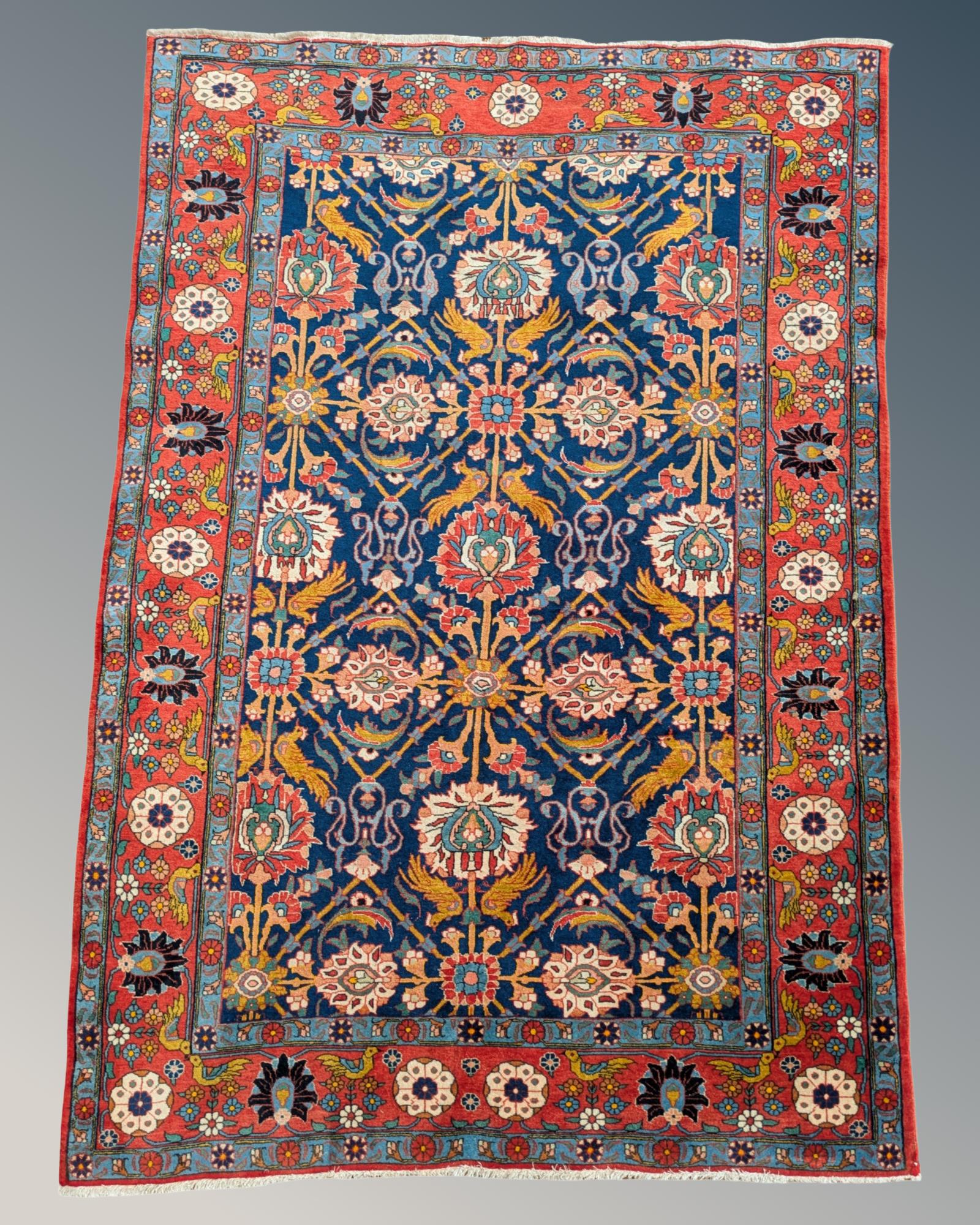 The indigo lattice field of palmettes and vines features stylised flower heads and golden pheasant birds. It is framed by soft terracotta borders with more flowerheads and birds, flanked by rosette guard stripes.