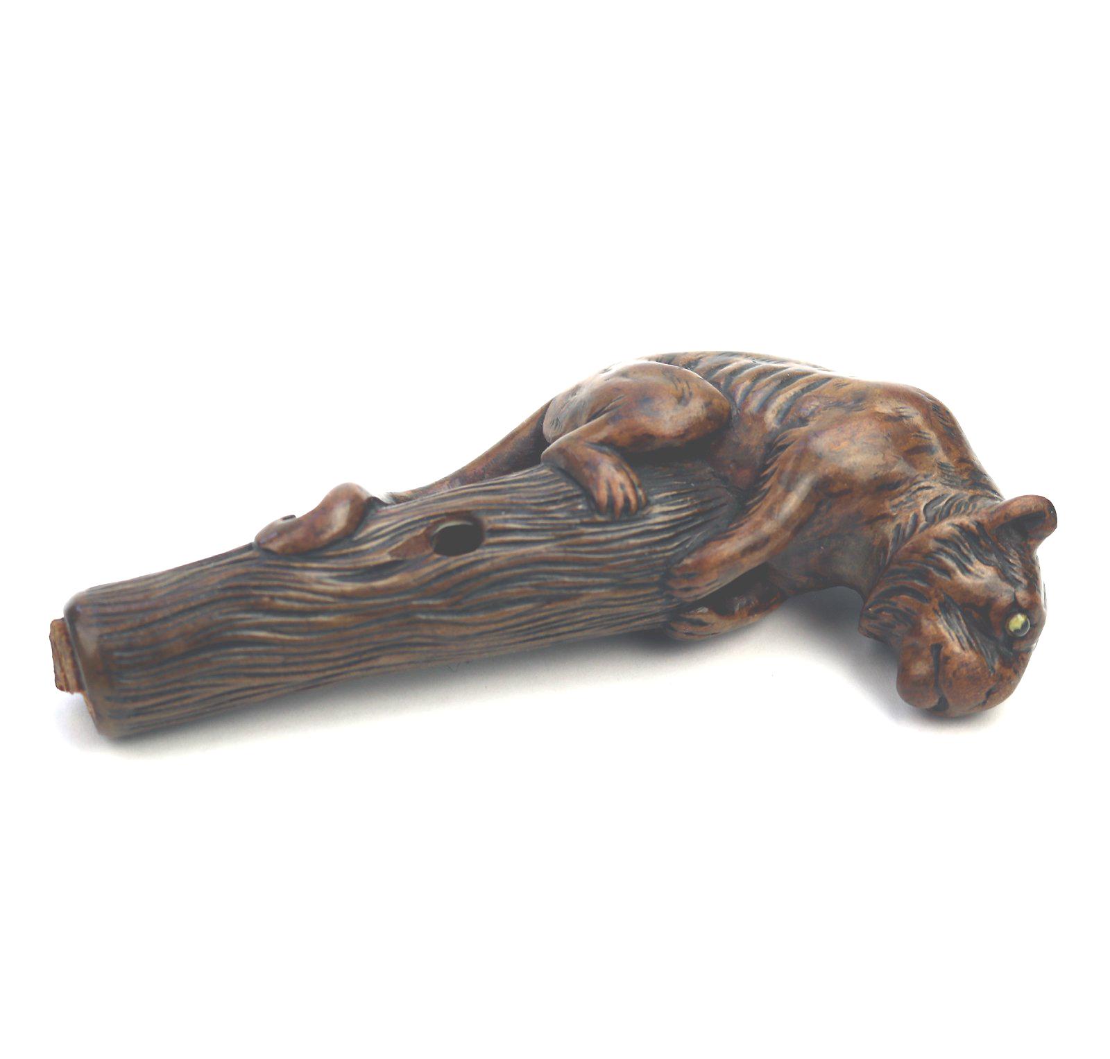 Good Carved Boxwood Novelty Parasol Handle of Tiger Glass Eyes c.1900