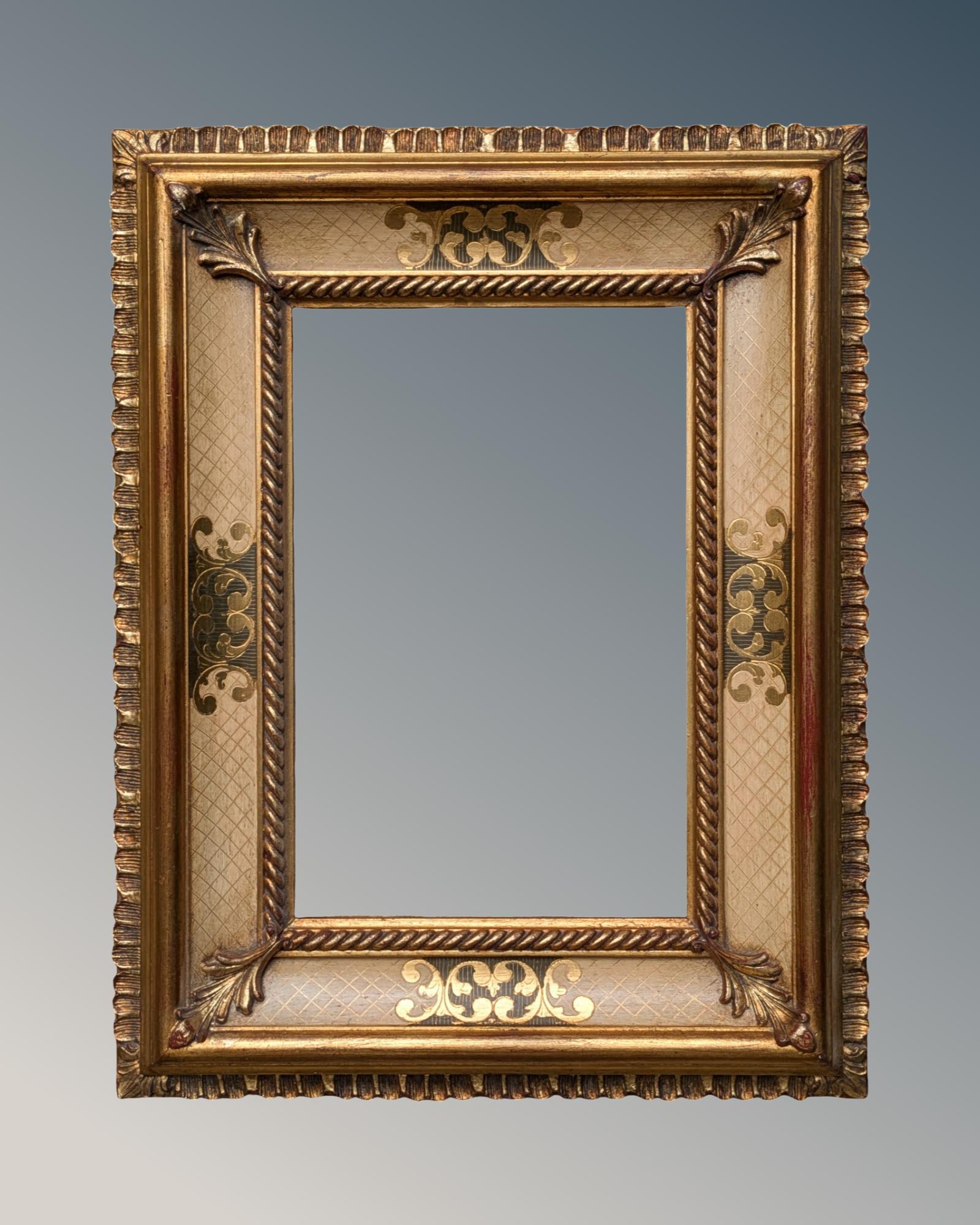 This is a good quality decorative Italian gilt wood frame in excellent original condition with a deep cushion design and attractive painted and gilded mouldings.