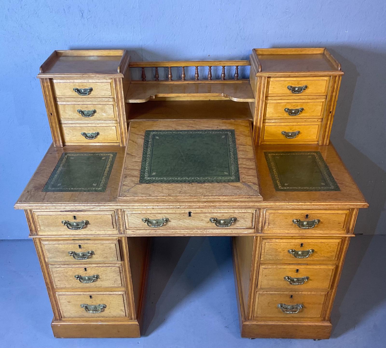 An attractive Victorian Dickens desk, the upper section has a rise and fall writing slope with 2 small drawers inside ,it has two banks of drawers to either side of the desk with three small drawers to each one these are locked with a vertical strip of wood the the side of each bank of drawers below this is a pair of larger drawers to the right and left, the centre drawers is a dummy drawer to allow for the well underneath the writing slope, the two bases have three drawers each, it has an interesting label to the back which mentions Harrods I am not sure if this is the famous London store of Harrods, the colour is good the first photo is a good likeness the others have to much light from the flood lights I will take and add better ones later