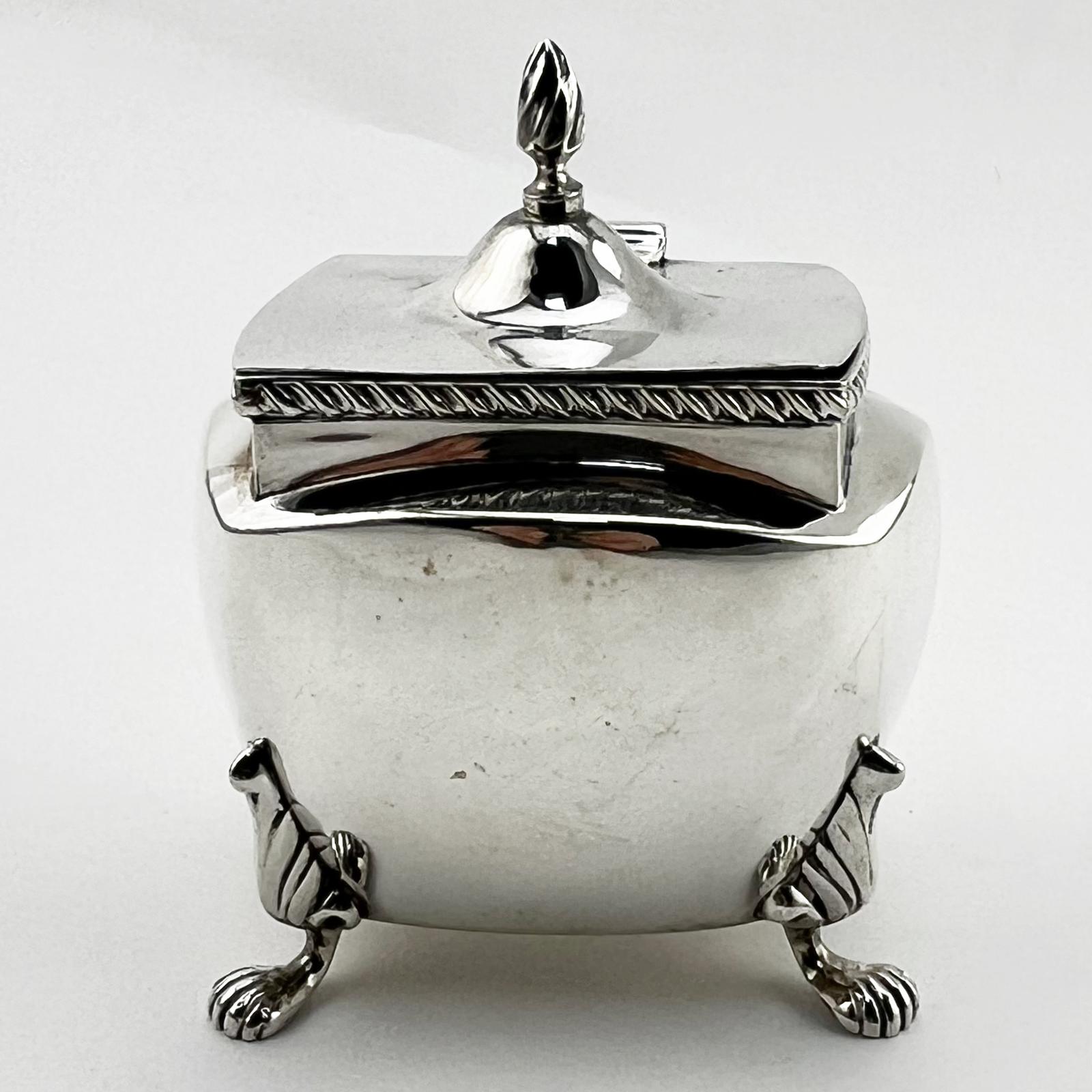 A very good gauge late Victorian (1900) Sterling Silver tea caddy. In a shaped rectangular form with a hinged lid and a flame finial. Plain body without any inscriptions and stands on four cast paw style feet. Very good original condition without any inscriptions or dents.