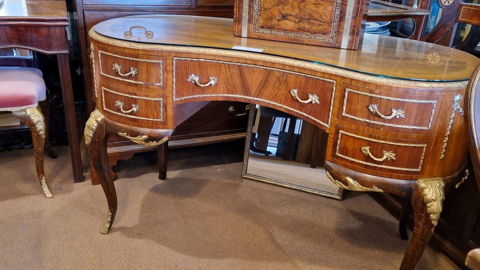 This is a kidney-shaped desk or dressing table from the 20th century. It features a smooth surface and gently curved edges, typical of the design style from this period. The piece is constructed from wood, and may include decorative elements such as drawer pulls or inlays. Suitable for use as a functional workspace or as a dressing surface.it includes a set of triple mirrors and brackets if to be used as a dressing table comes and has lovely gilt brass mounts all around.