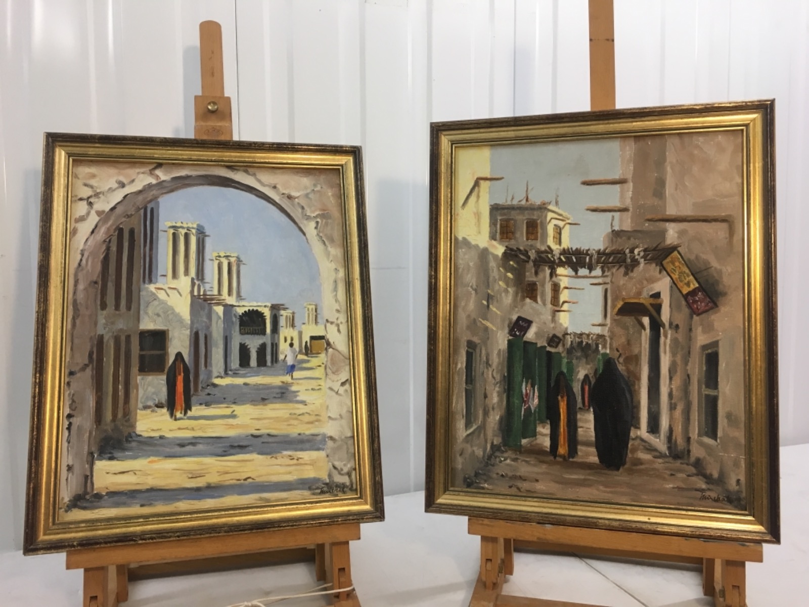 Good Pair North African Middle Eastern Townscape Oil Paintings