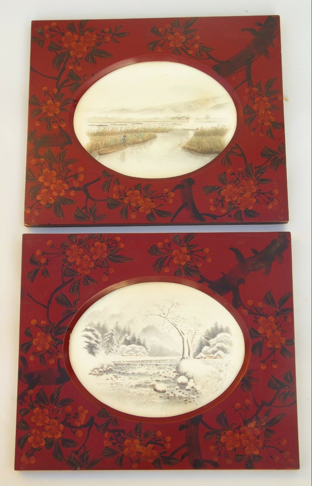 Good Pair of Japanese Watercolour Paintings in Red Lacquer Frames