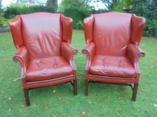 Good Pair of Mahogany & Leather Wing Armchairs / Library Chairs c.1920