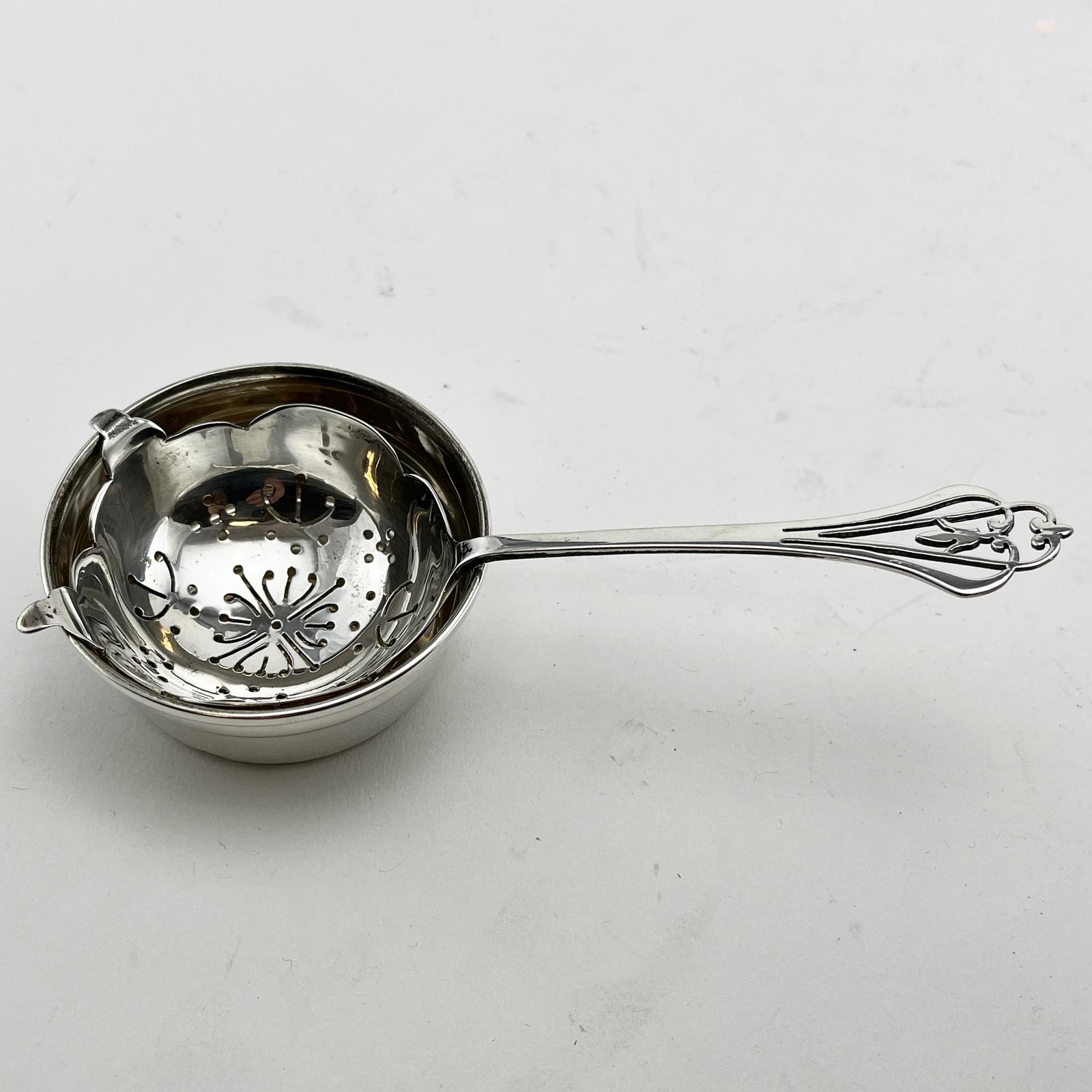 A very nice quality sterling silver tea strainer. With a floral pierced spoon shaped handle and pierced floral bowl and matching drip bowl. In very good original condition with matching hallmarks. (1973). Strainer dimensions: Length: 14cm (5.5"). Diameter: 5.7cm (2.25") Bowl dimensions: Height: 2.5cm (1") x Diameter 6.3cm (2.5")