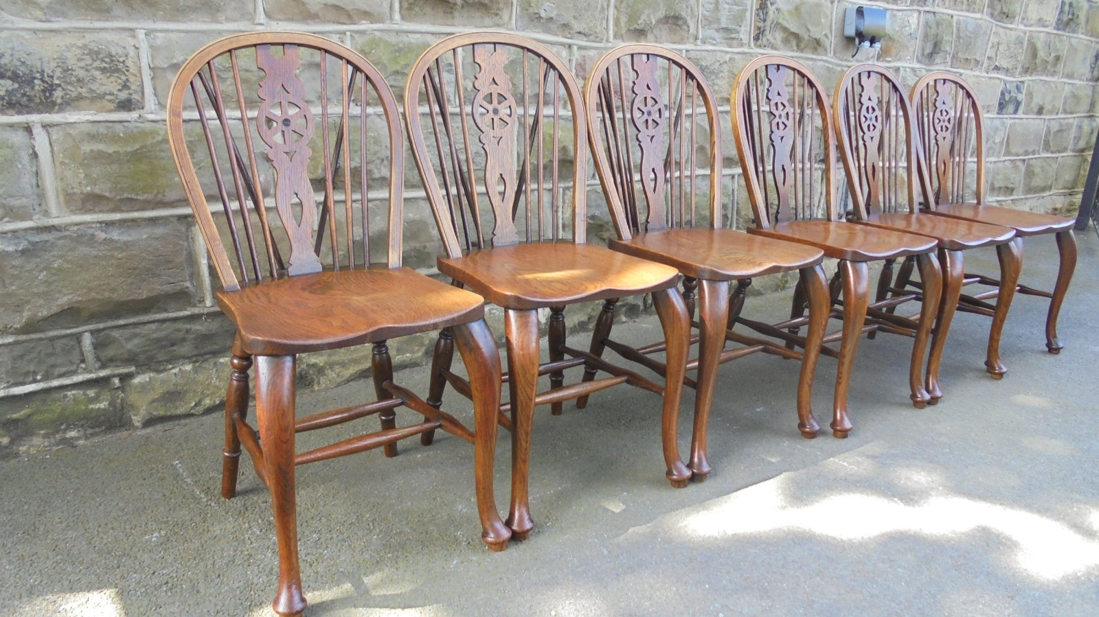 Good Set 6 Antique Elm Wheel Back Kitchen Chairs