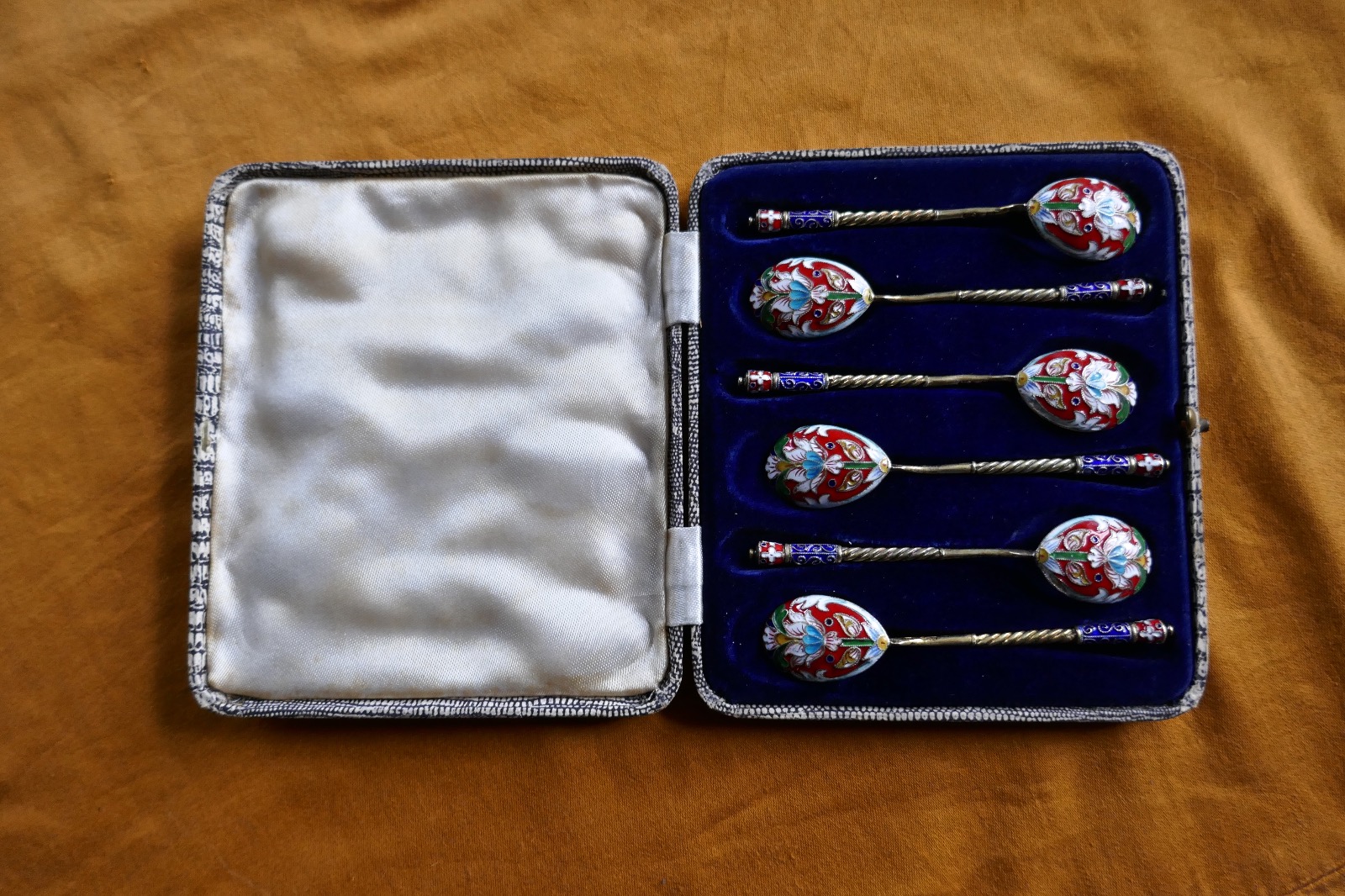 Good Set of 6 Russian Imperial Silver Polychrome Cloisonné Enamel Spoons