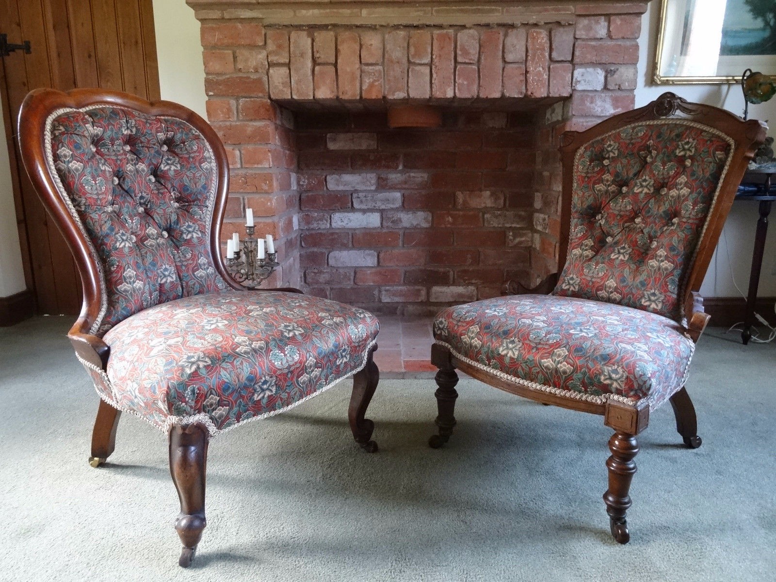 Gorgeous Pair of 19th Century Victorian Walnut Upholstered Designer Fabric Armchairs