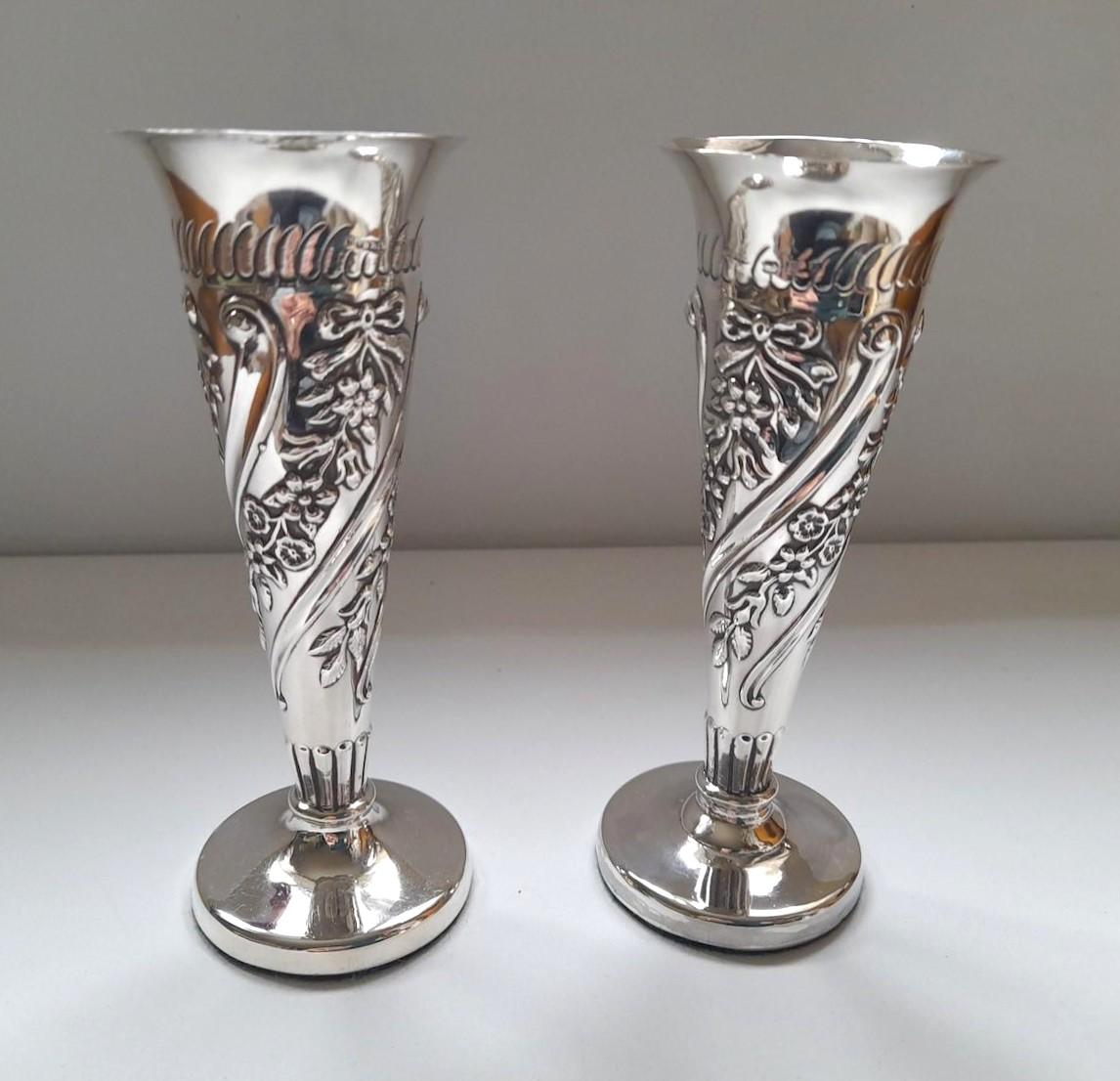 A gorgeous pair of small Victorian silver trumpet vases. The Art Nouveau design features repoussé decoration of floral garlands and scrolls. The interiors show faint traces of the original gilt wash and the bases are weighted for extra stability.
