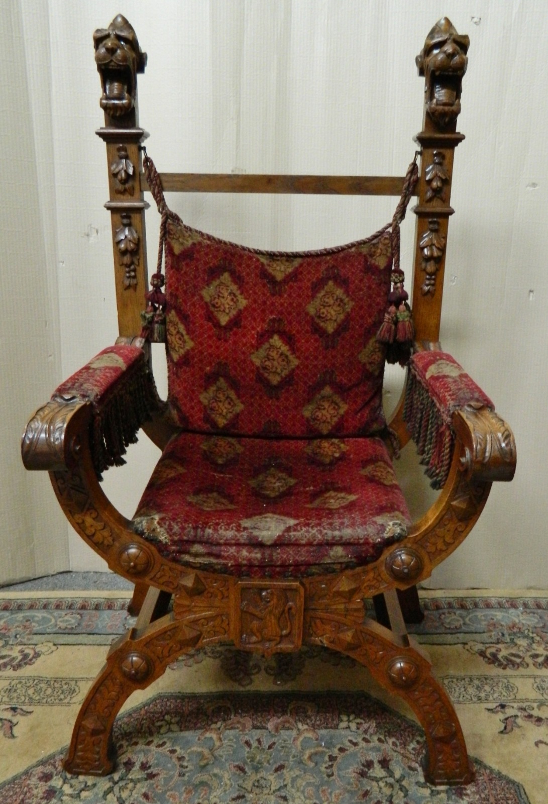 Gothic Carved Oak 'Throne' Chair / X Frame Chair c.1890