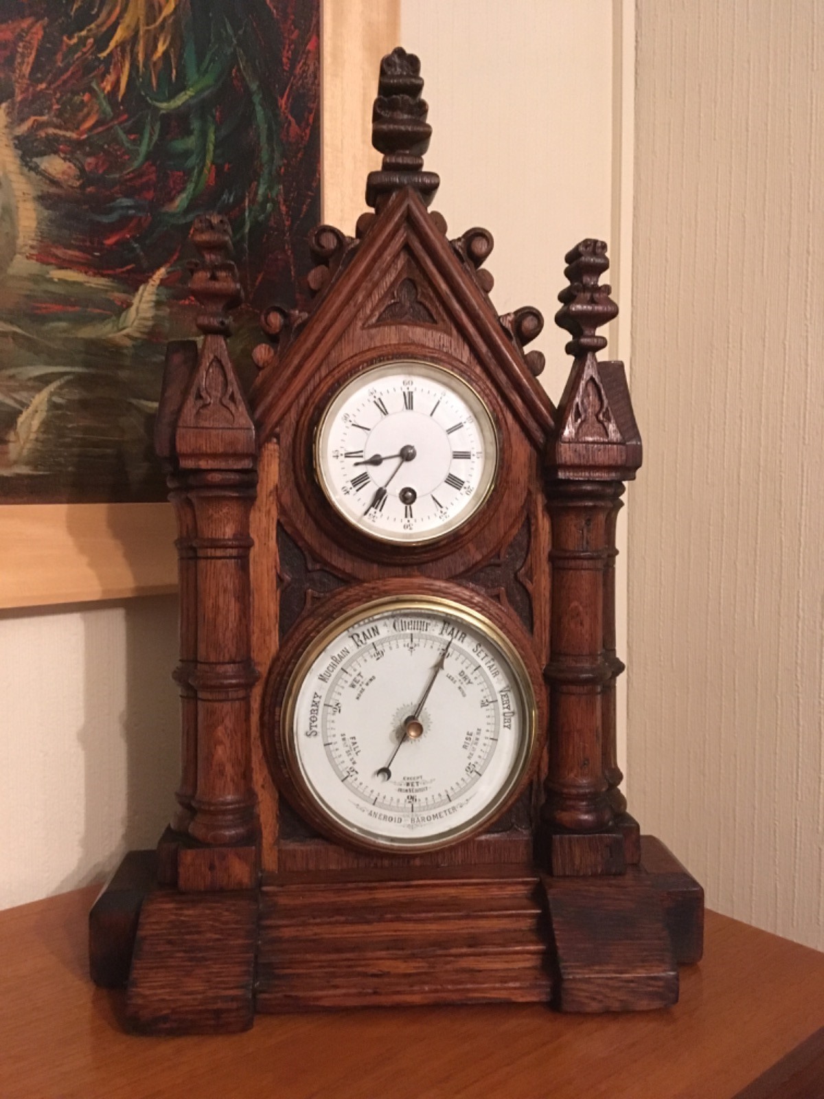 Gothic Oak Cased Mantel Clock & Barometer