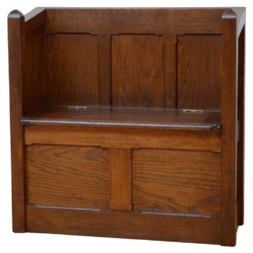 Late 19th Century (circa 1880) Victorian Gothic revival hall bench in solid oak, having panelled back, sloping sides and lift up seat enclosing storage compartment above panelled base. This antique hall bench retains its original finish, colour and patina, all in home ready condition.