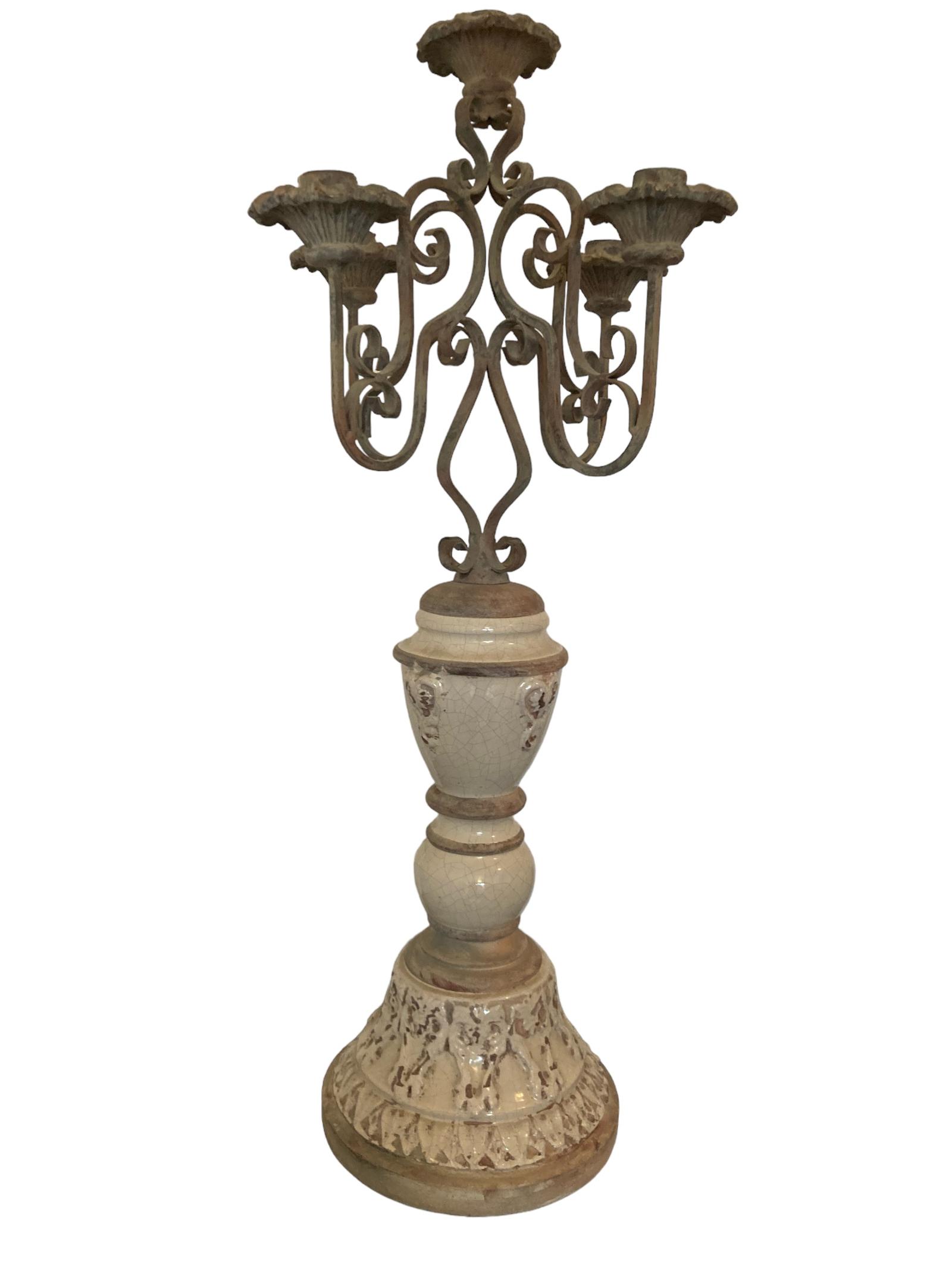 Gothic Style Five Candle Candelabra Wrought Iron with Ceramic Base from Germany