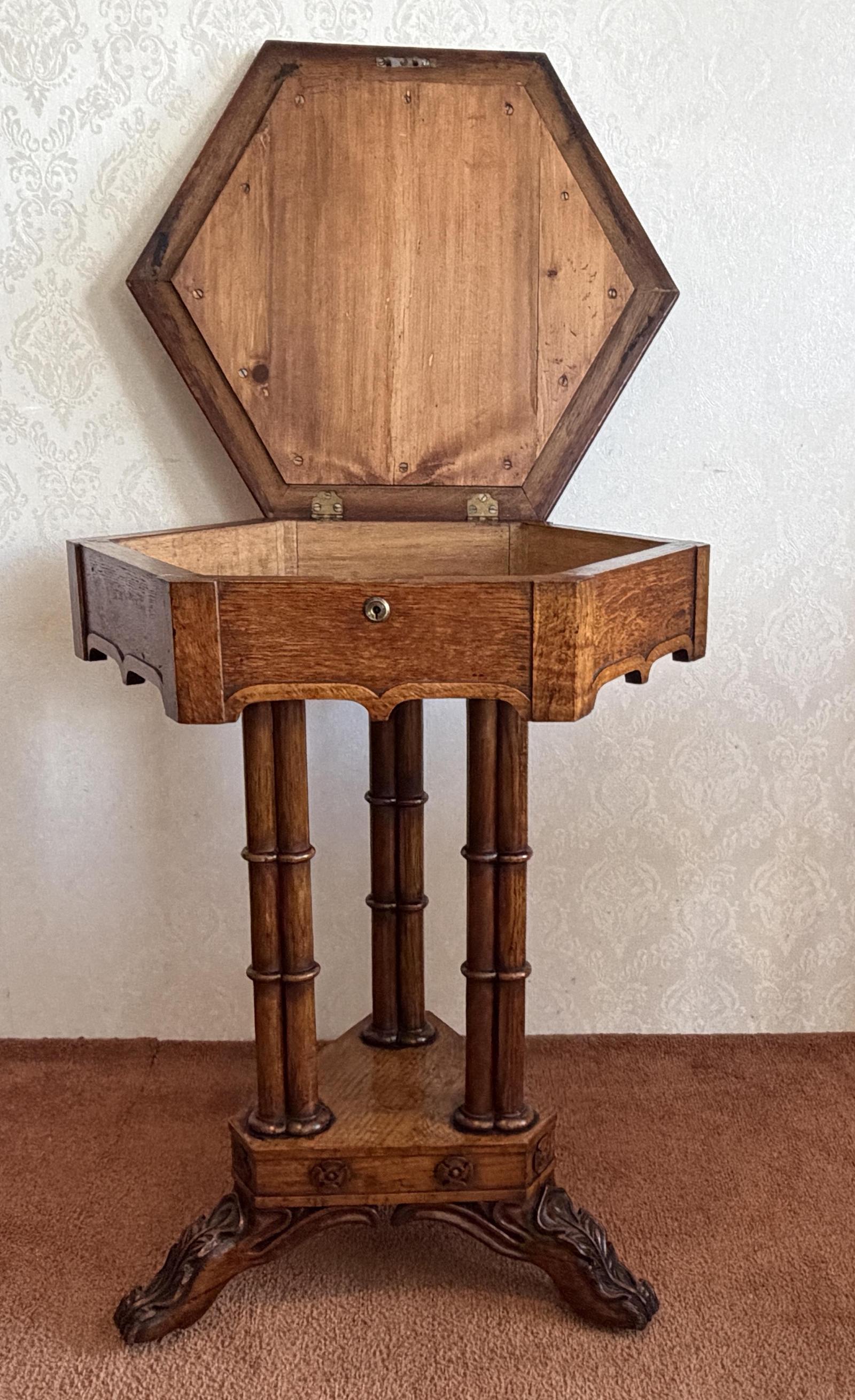 Unrestored Gothic style 19th Century (circa 1840) antique hexagonal table with shallow compartment under lid. Wonderful carved feet and clustered column. Amazing burr oak timber.