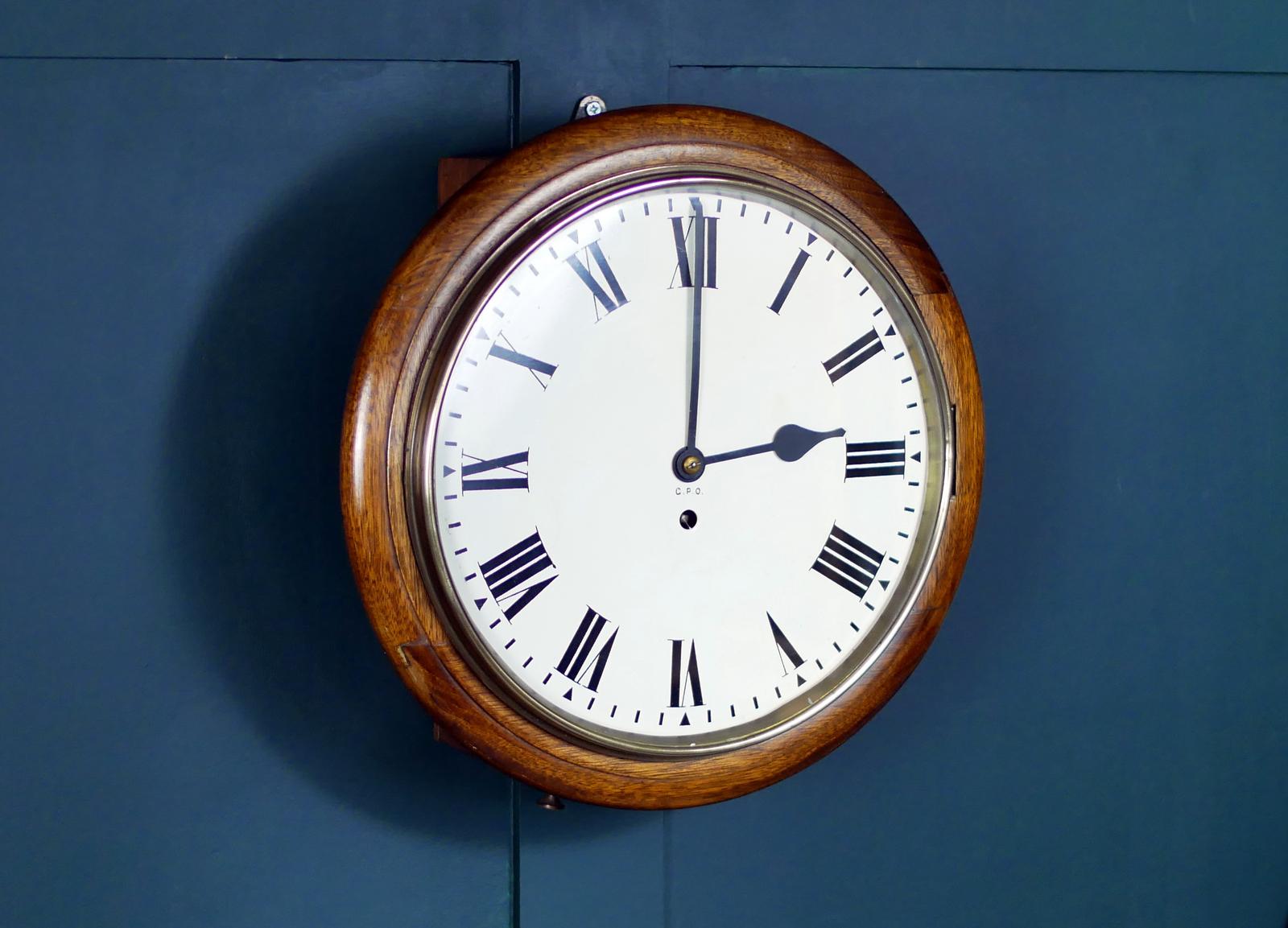 GPO Wall Clock Station Style Fusee Mahogany Cased Mid 20th Century