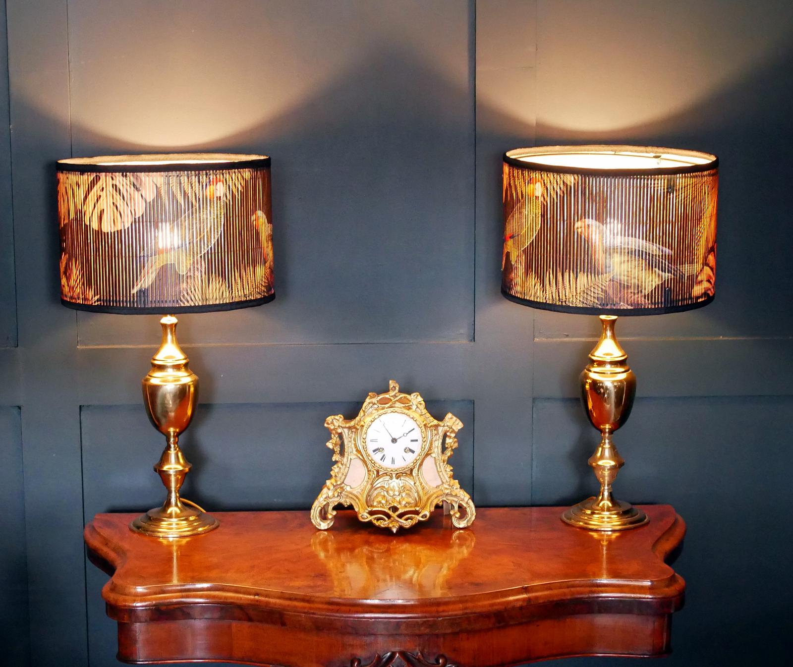 Bespoke Artistry: Topped with custom, drum-shaped shades featuring a lush Tropical Aviary motif. The rich greens and vibrant bird illustrations provide a stunning organic contrast to the structured, metallic brilliance of the brass.