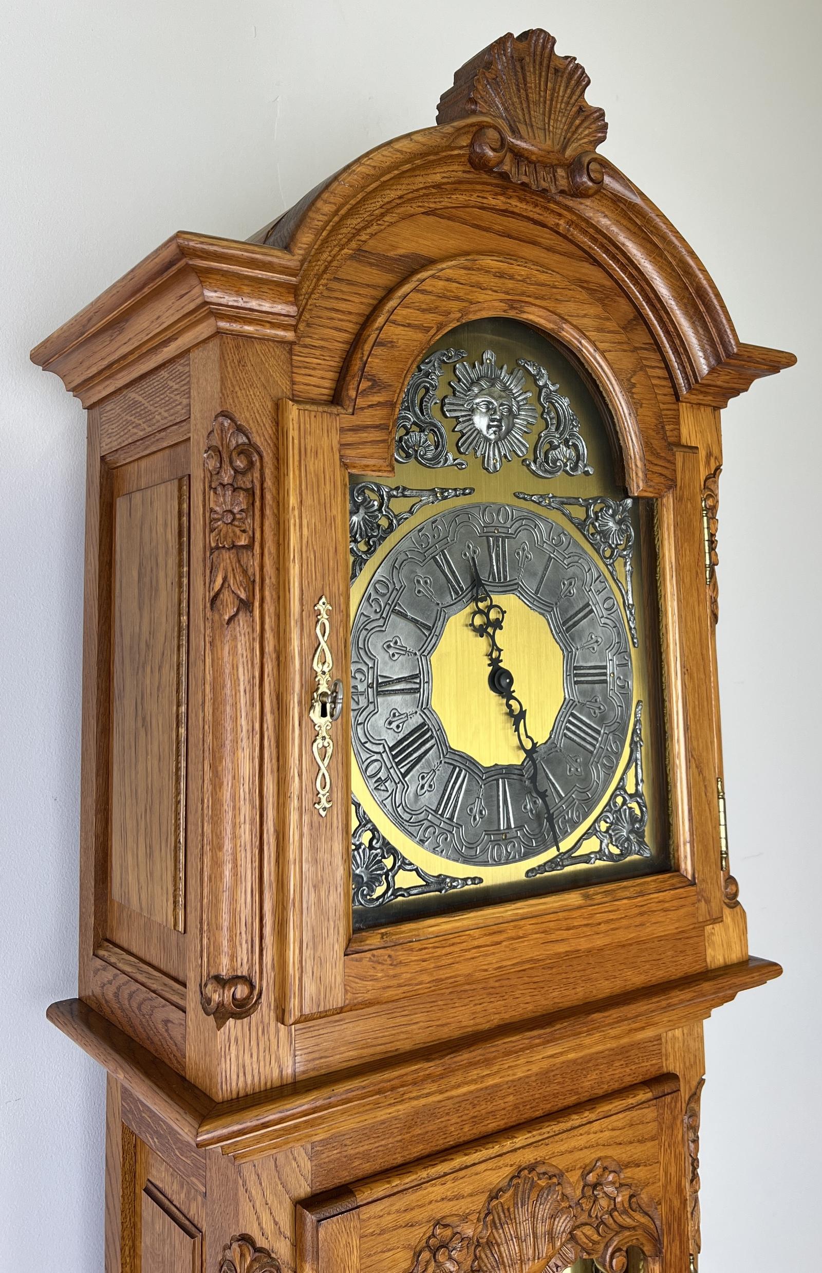 This impressive clock features a richly grained oak wood case with finely carved decorative elements typical of the French Louis style. The arched hood is crowned with a carved shell motif and framed with elegant detailing. The decorative dial showcases Roman numerals with intricate metal corner ornaments and a sun motif above the dial. Behind the glazed door, the classic pendulum and weight system is beautifully displayed, highlighting the traditional longcase clock design.