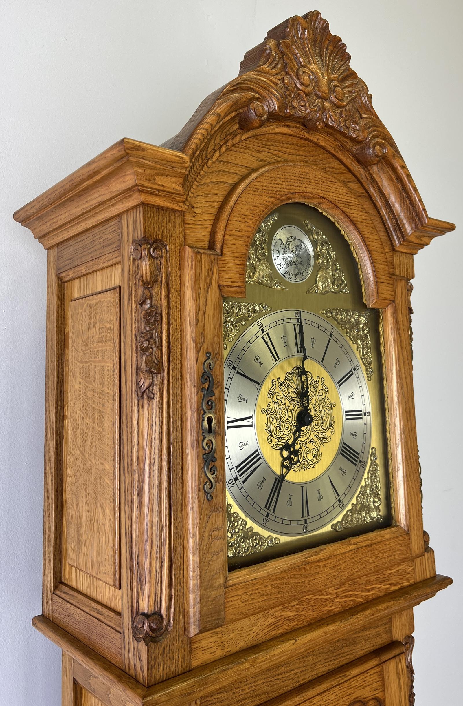The clock features a warm oak wood finish with beautifully visible grain and carefully carved decorative elements. The brass dial with Roman numerals and ornate centre engraving enhances its traditional character, while the glazed door reveals the pendulum and weight-driven movement inside the case.