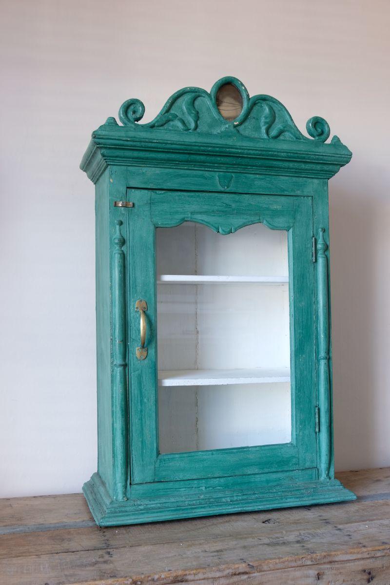 Green & Cream Painted Glass Cabinet with Decorative Pediment