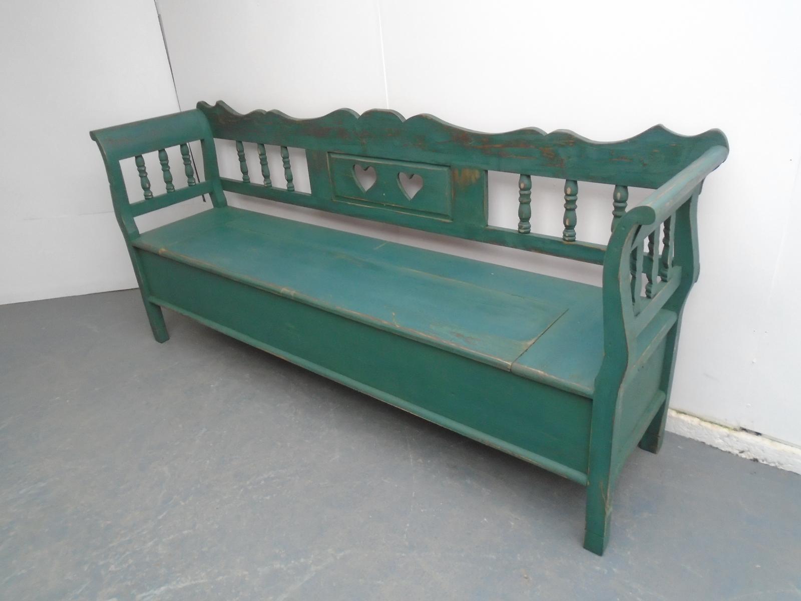 Green Heart Motif Antique Pine 3-4 Seater Box Settle / Bench