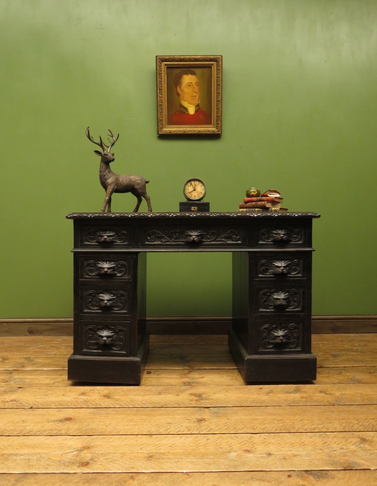 Green Man Carved Gothic Oak Pedestal Desk with Ebonized Finish & Leather Top