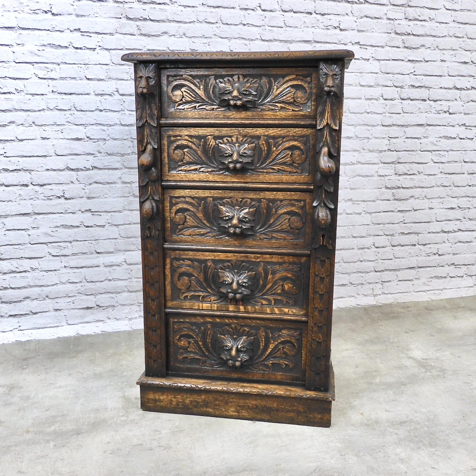 Green Man Carved Oak Wellington Chest of Drawers