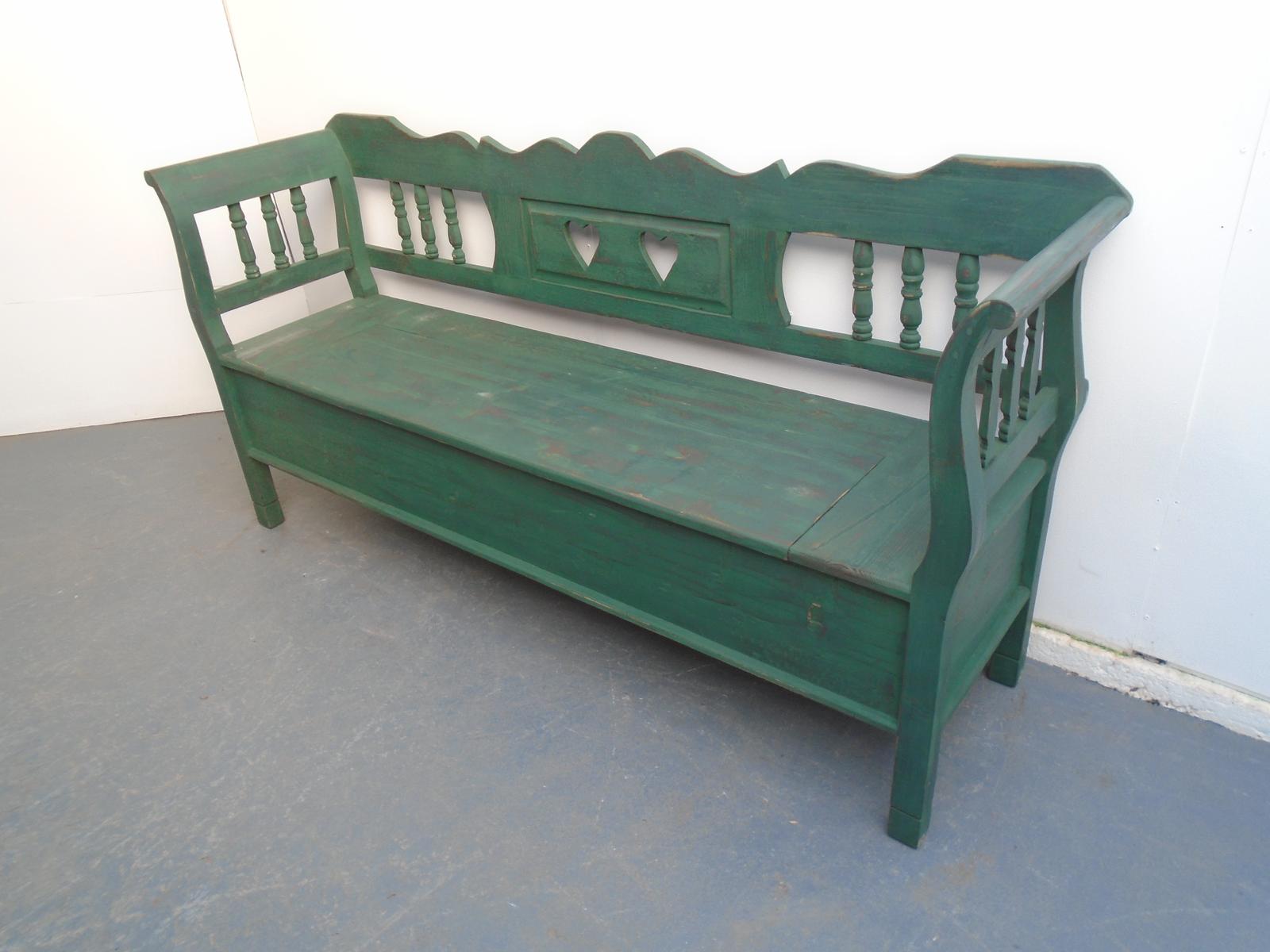 Green & Red Heart Motif Antique Pine 3 Seater Box Settle / Bench
