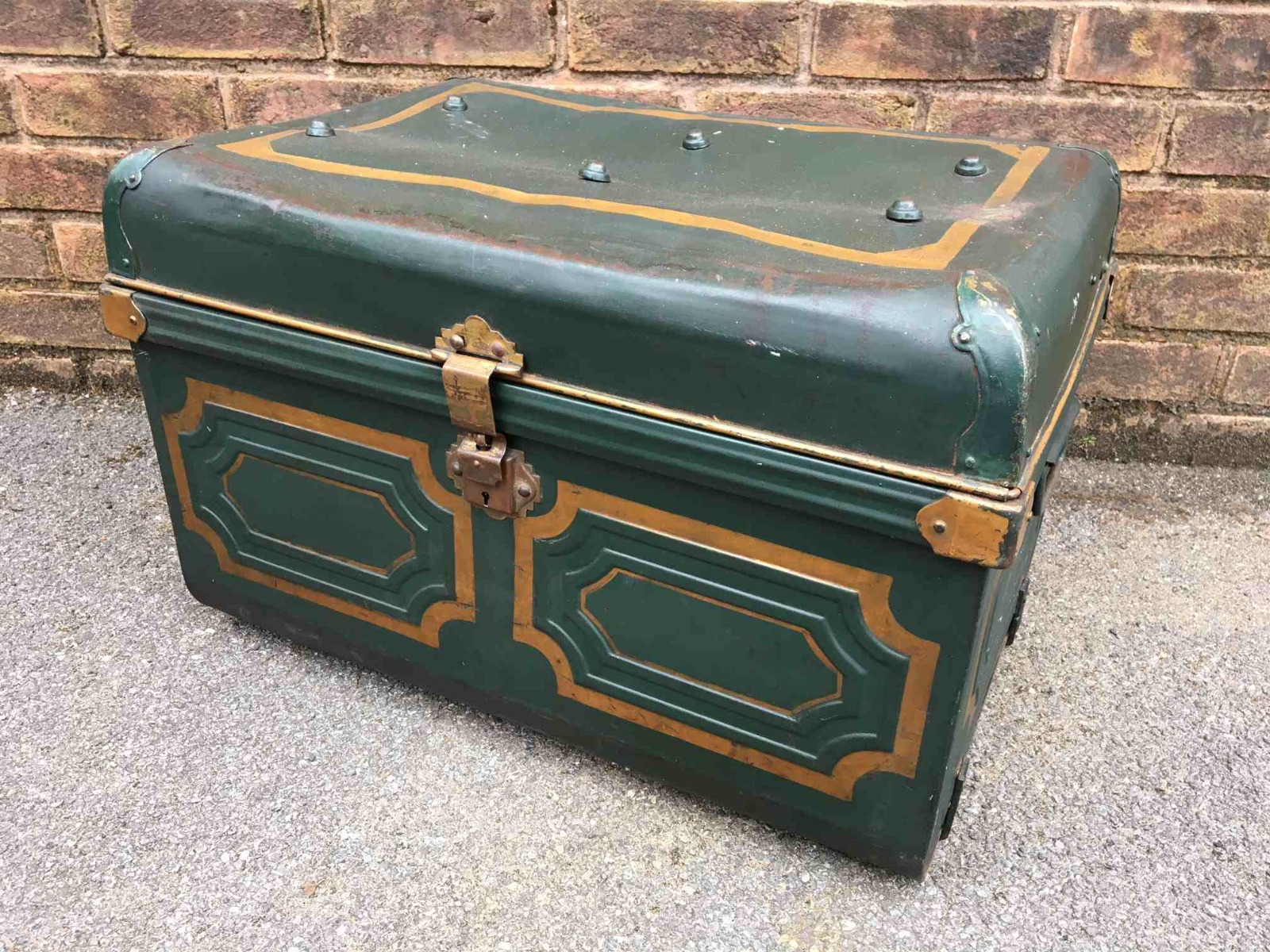 Green Vintage Metal Storage Trunk or Chest with Painted Detail (1 of 1)