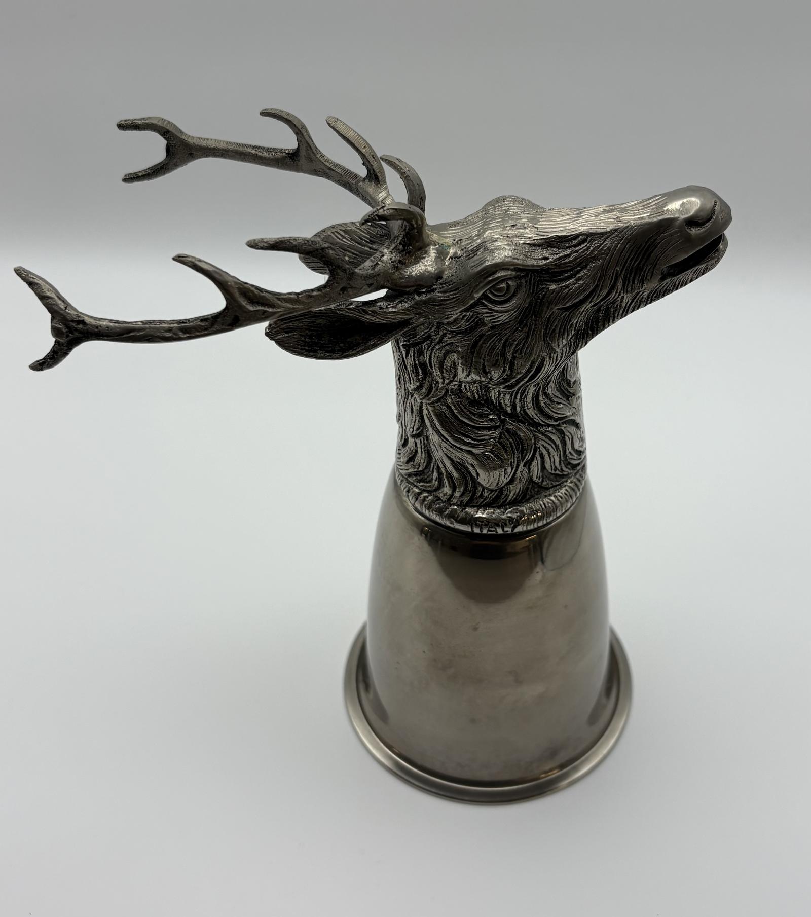 A silver plated stirrup cup in the form of a stag with antlers, circa 1970s, hallmarked Gucci, Italy. The upper part of the cup is formed as a finely sculpted stag’s head, the interior of each cup is silver. This item is a luxury piece of barware, both functional and decorative. Highly collectable. Originally inspired by 18th-century hunting traditions, these cups were often used for serving drinks at sporting or social events. The cup is signed "Gucci" and "Italy".